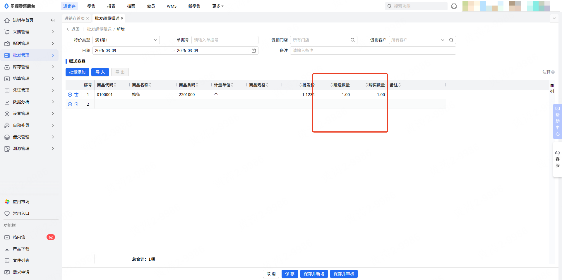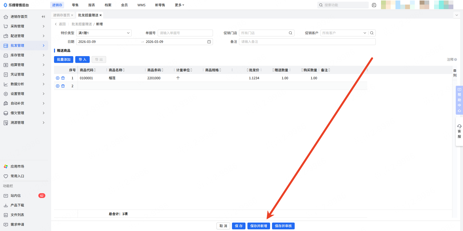 👉【操作路径】:进销存-批发管理-批发超量赠送