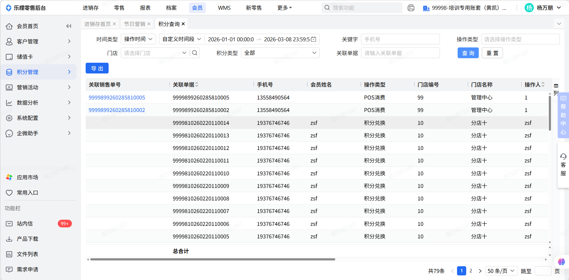 可以输入客户手机号或者会员卡号,点击查找,可以看到积分记录