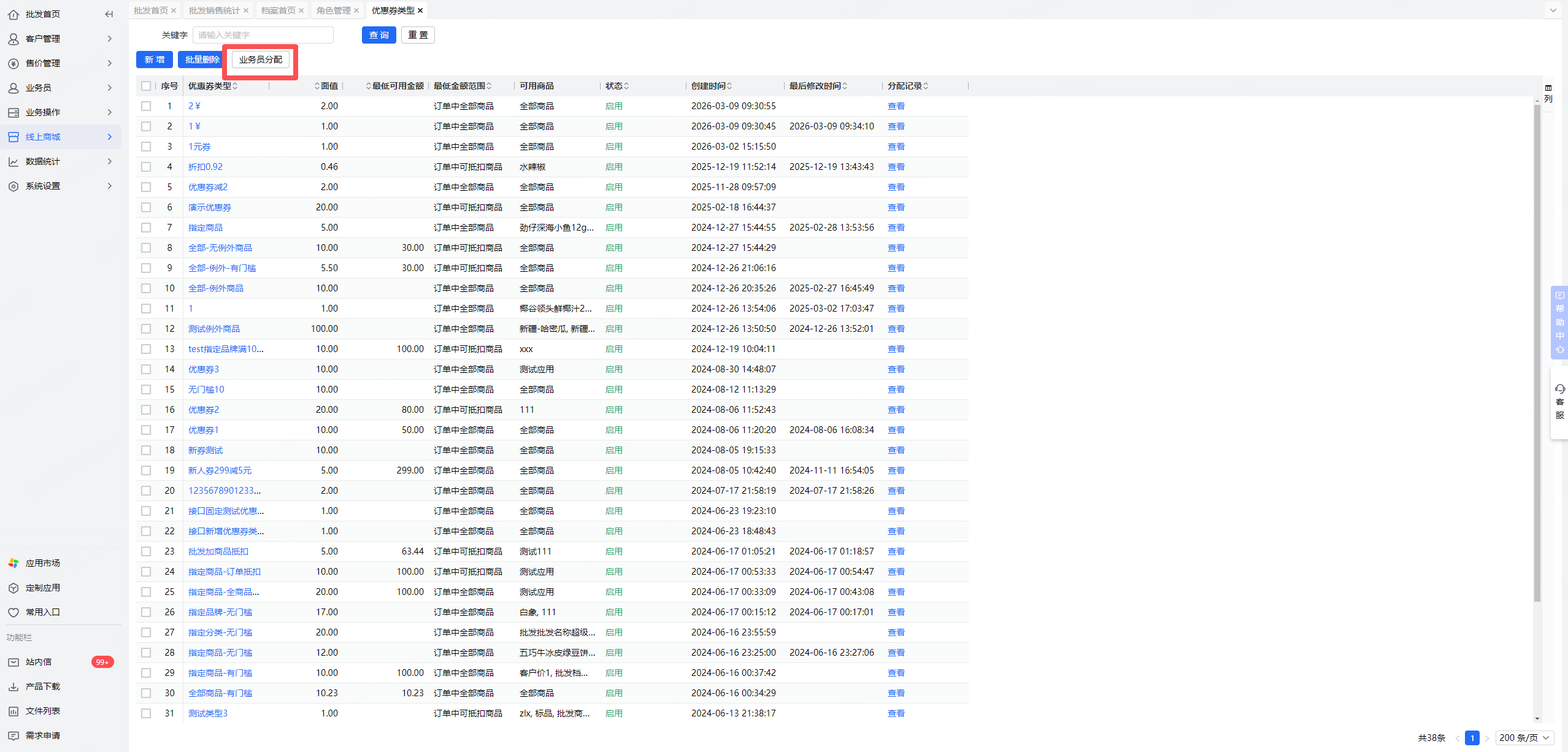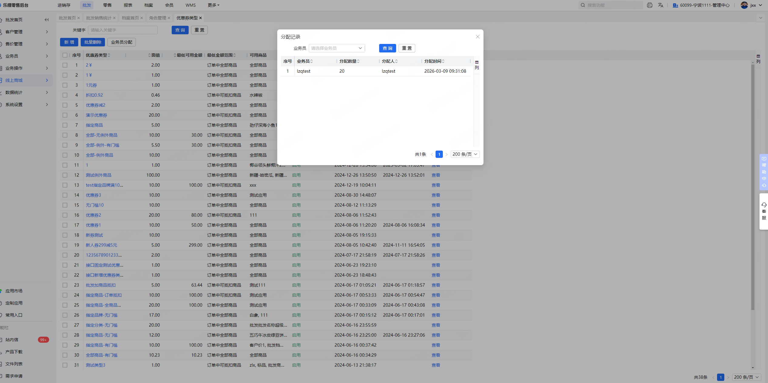 例如 给某位业务员派发 优惠券A 10张 优惠券B 5张;对应业务员可以根据自己的券进行下发批发客户进行维系客情