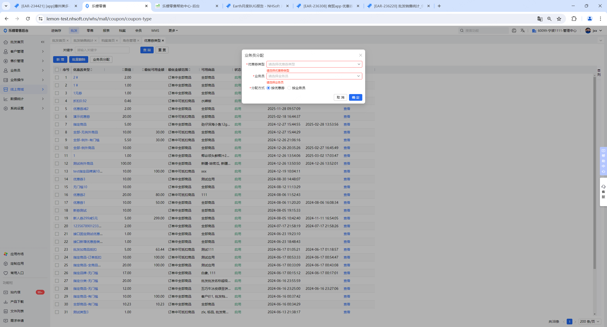 1、优惠券类型:新增一个按钮“业务员分配”,点击弹出业务员分配弹窗,可以将优惠券发放的额度分配给业务员,业务员可登录app将优惠券发放给客户;该按钮权限:通过编辑控制