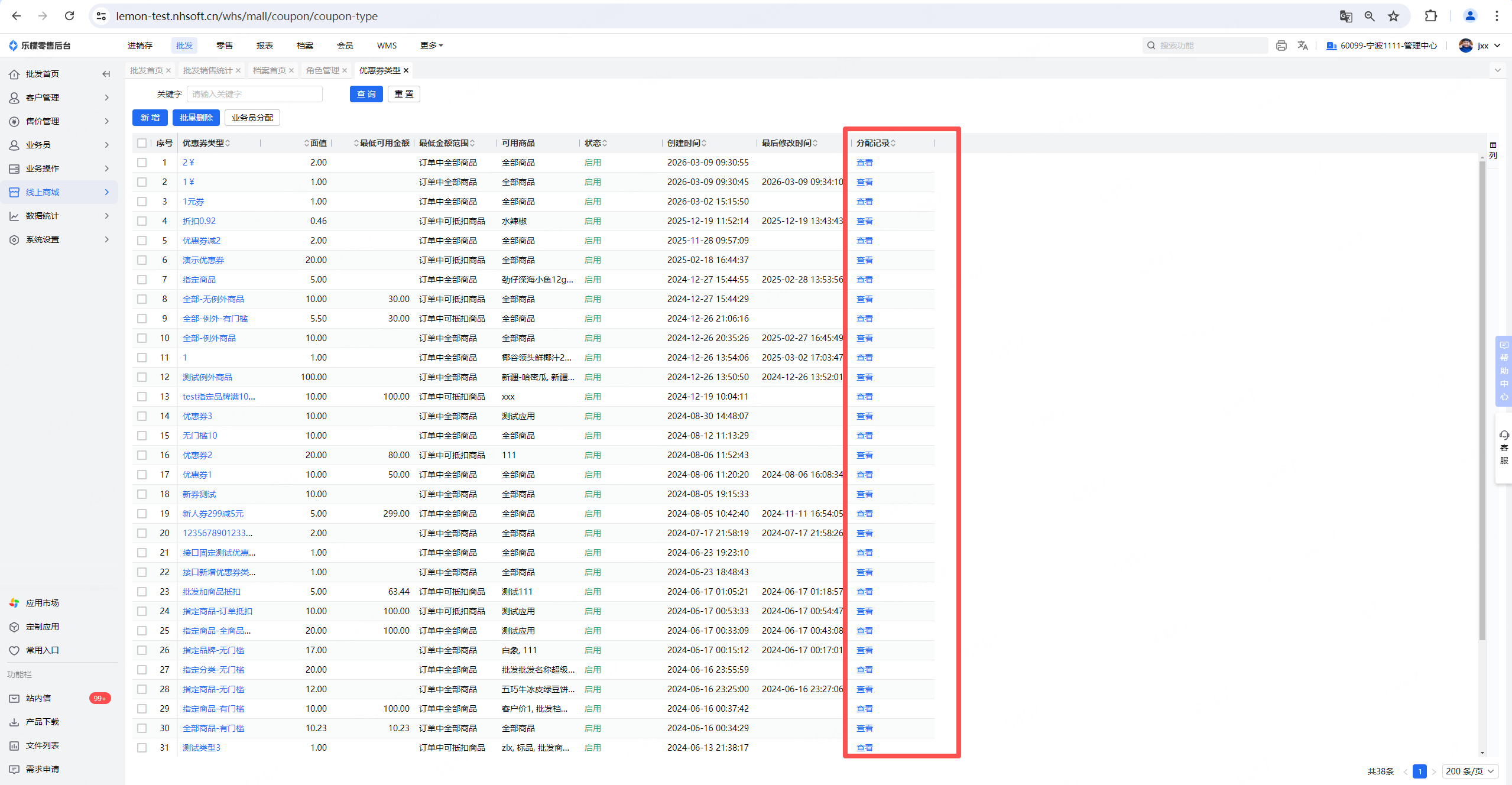 2、优惠券类型列表新增一列“分配记录”,点击查看弹出分配记录弹窗,可查看历史的分配记录
