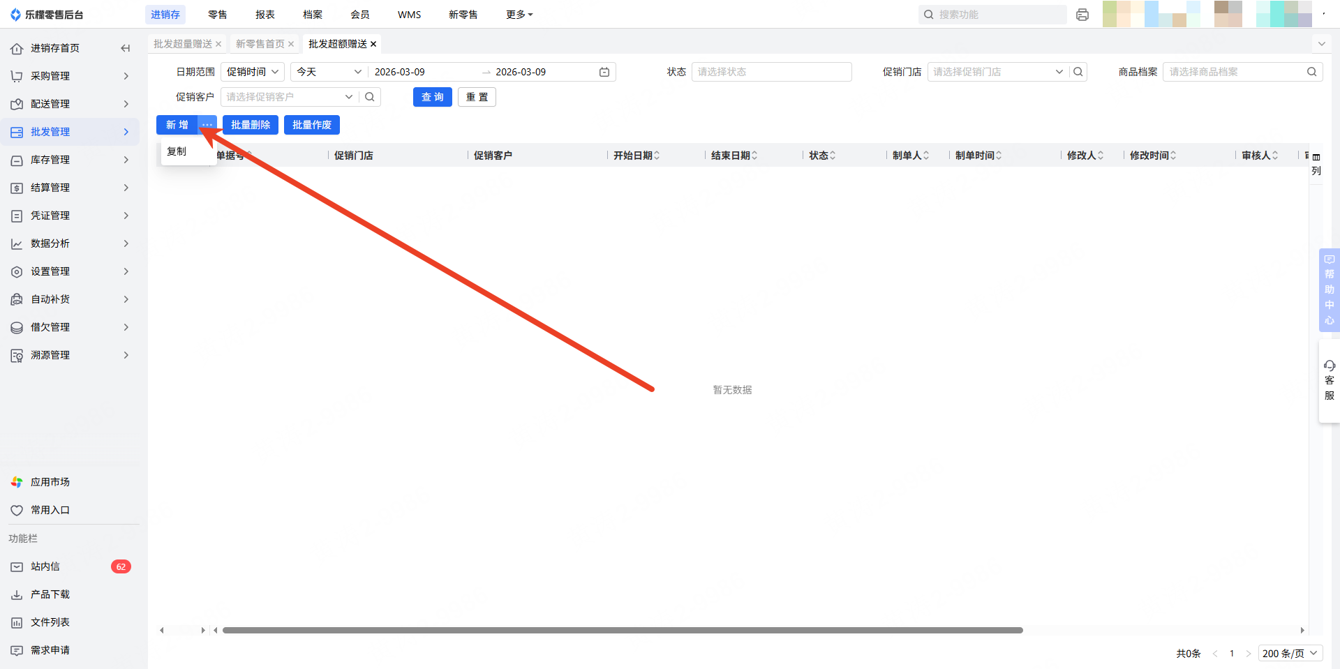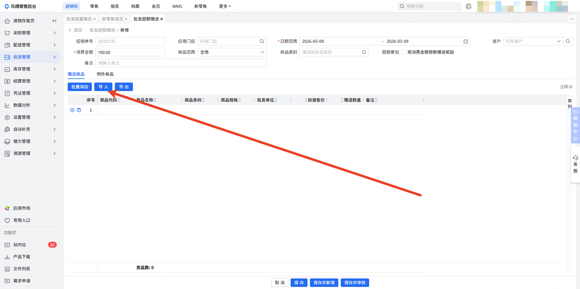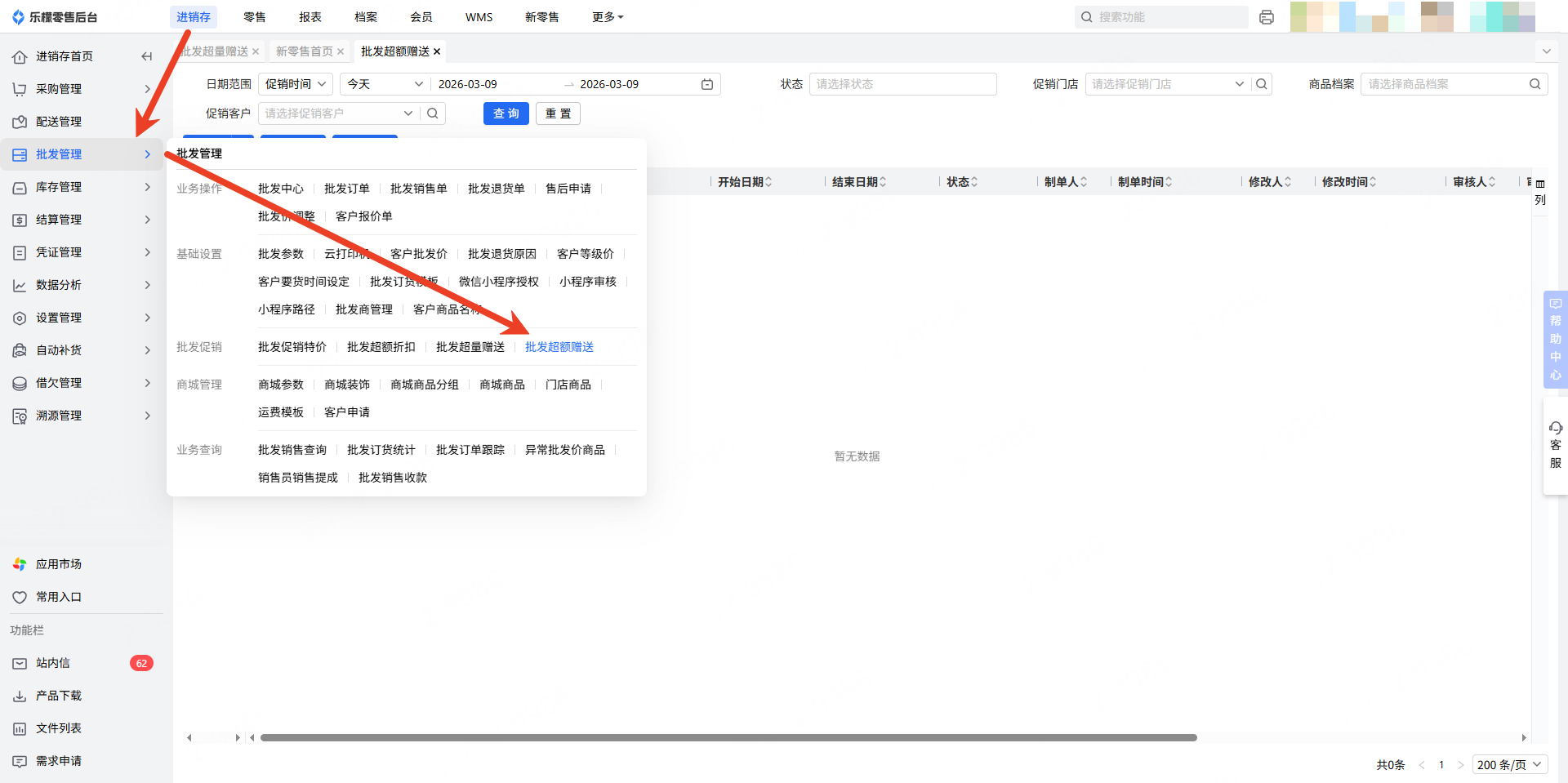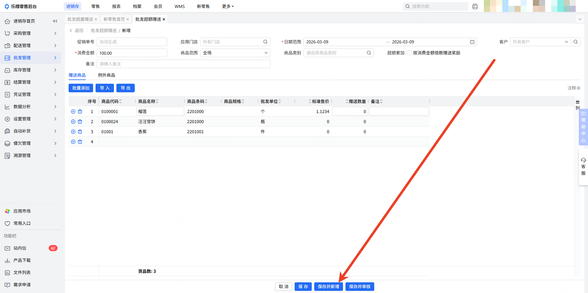 👉【操作路径】:进销存-批发管理-批发超额赠送