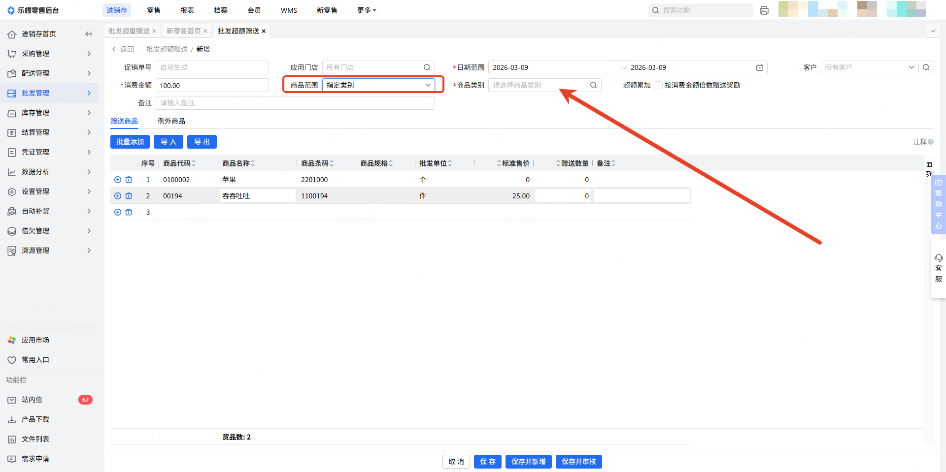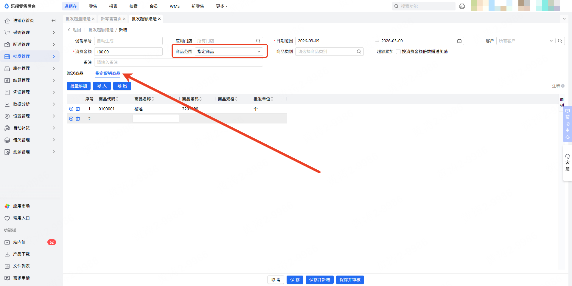 消费金额:批发客户消费到指定额度及以上后,订单审核通过后,单据明细将自动添加对应赠送商品