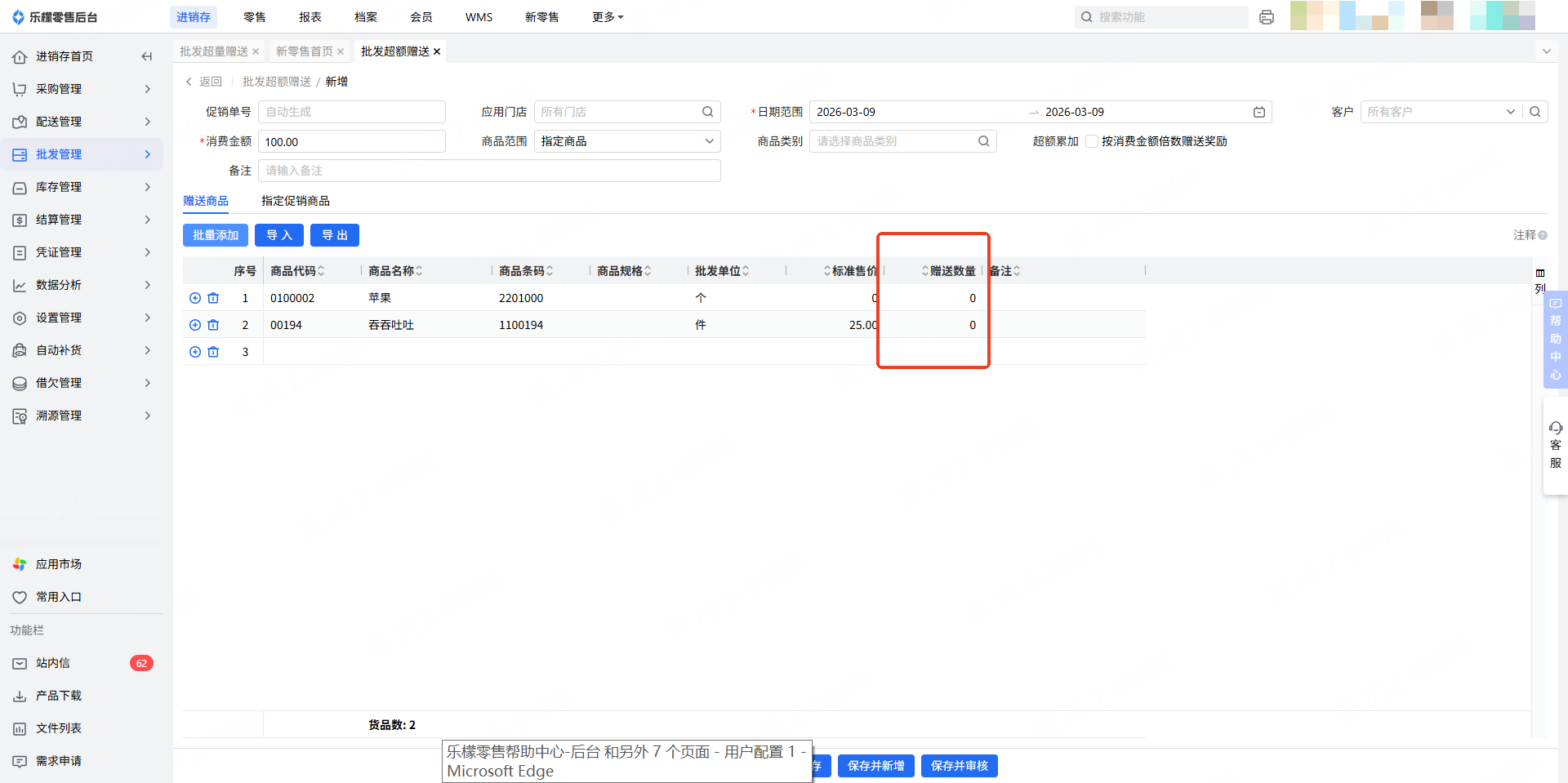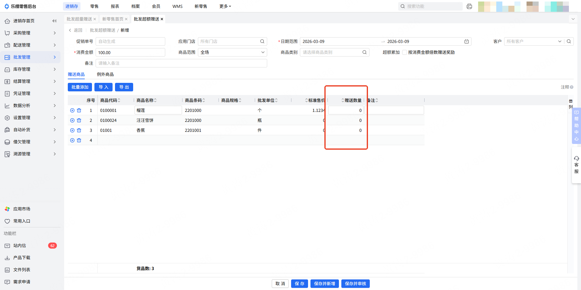4.添加好相应超额赠送商品后,填写需要赠送数量。