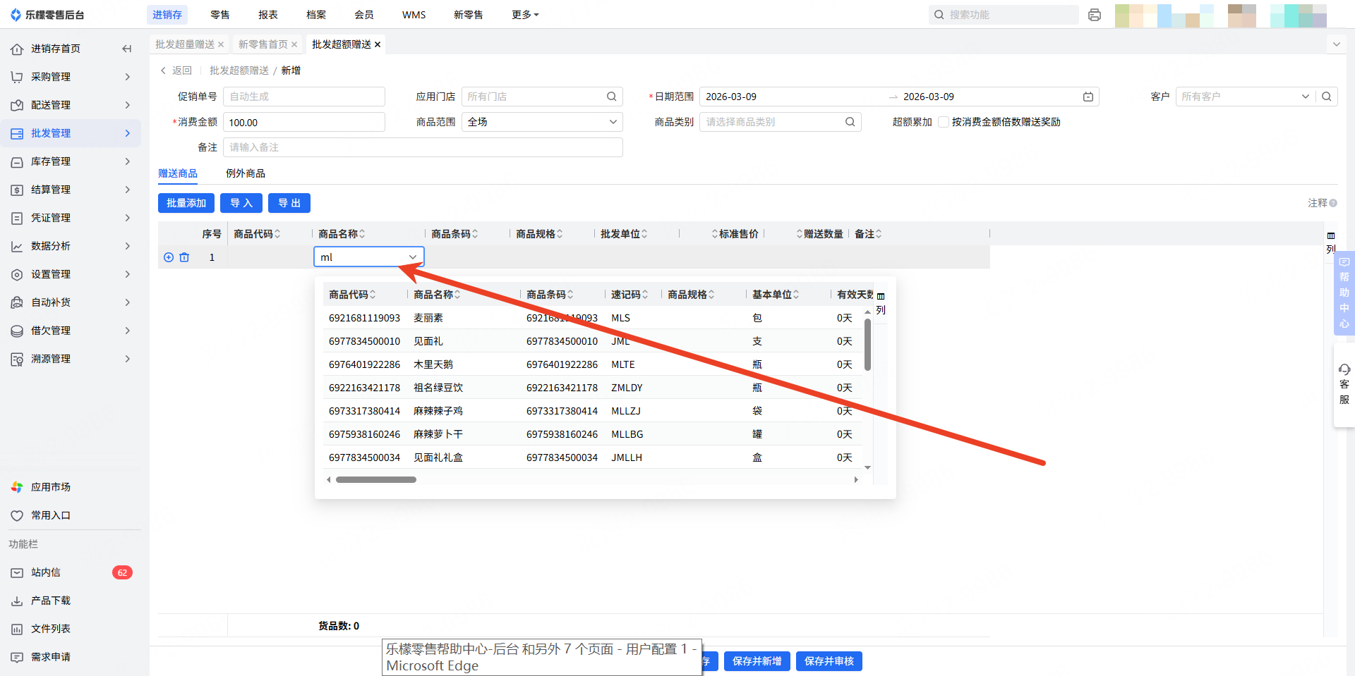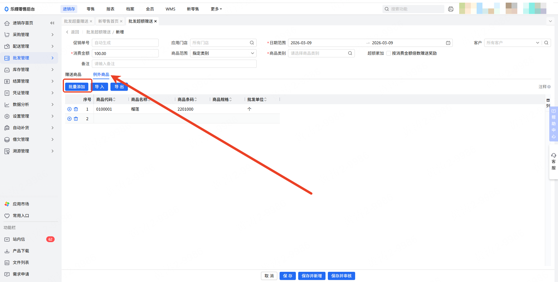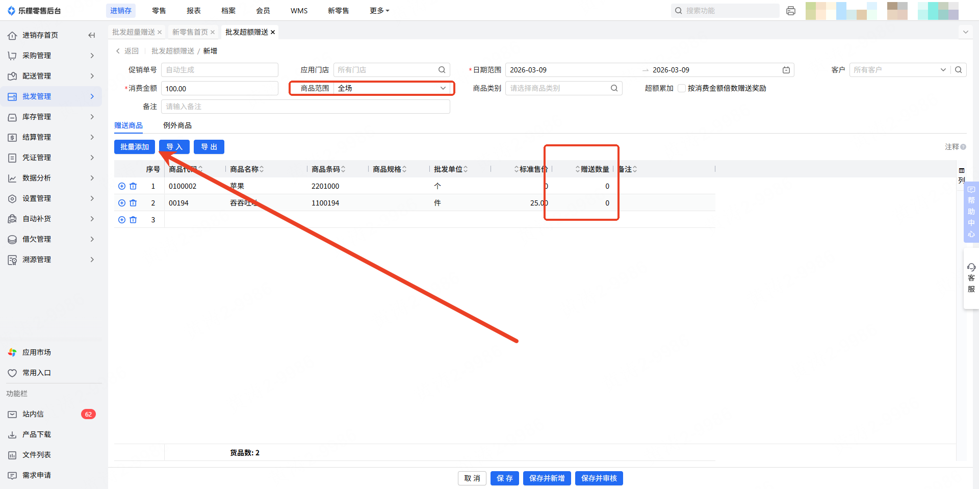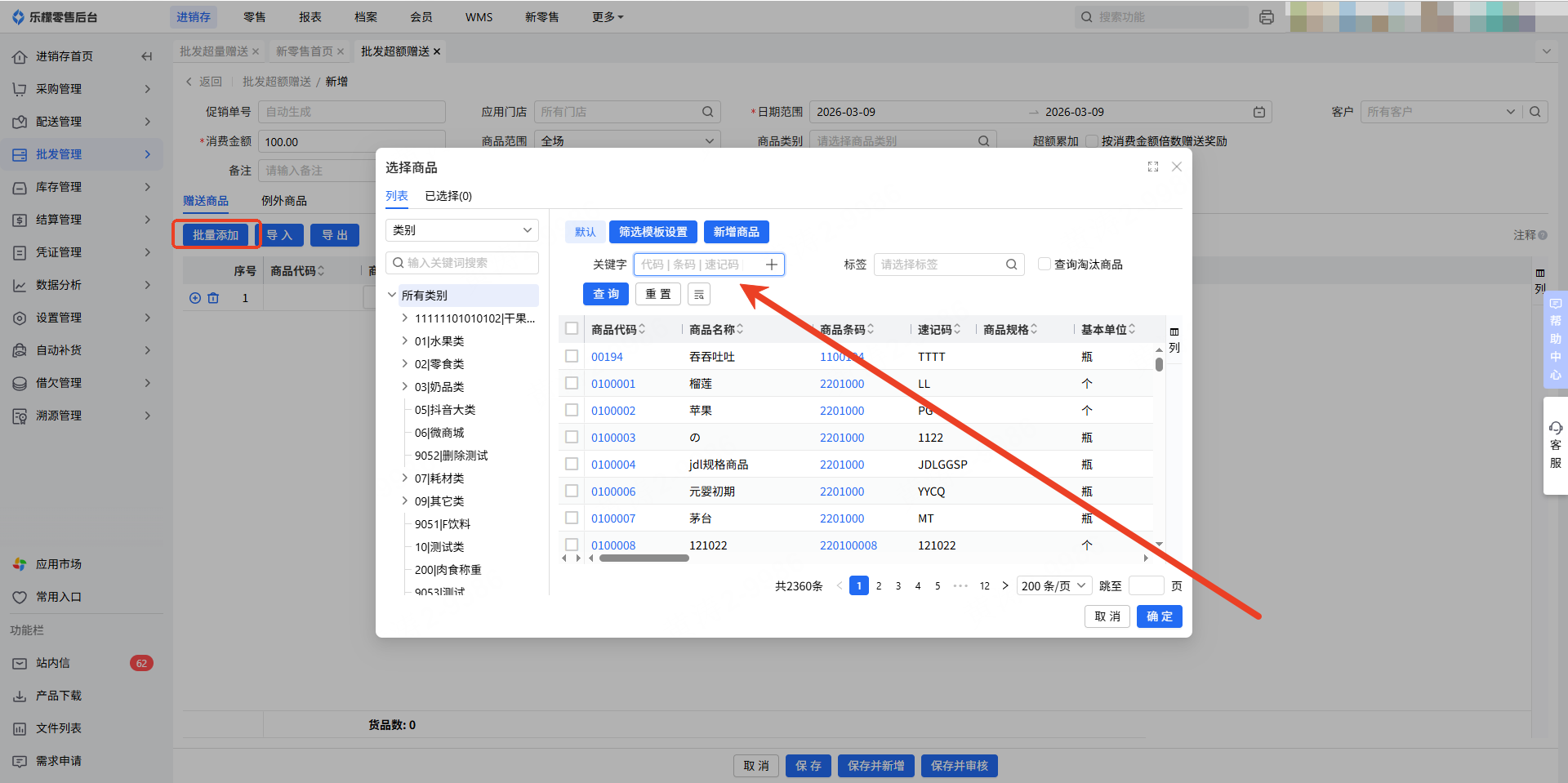 3.点击”批量添加“按钮,进行批发超额赠送商品的添加