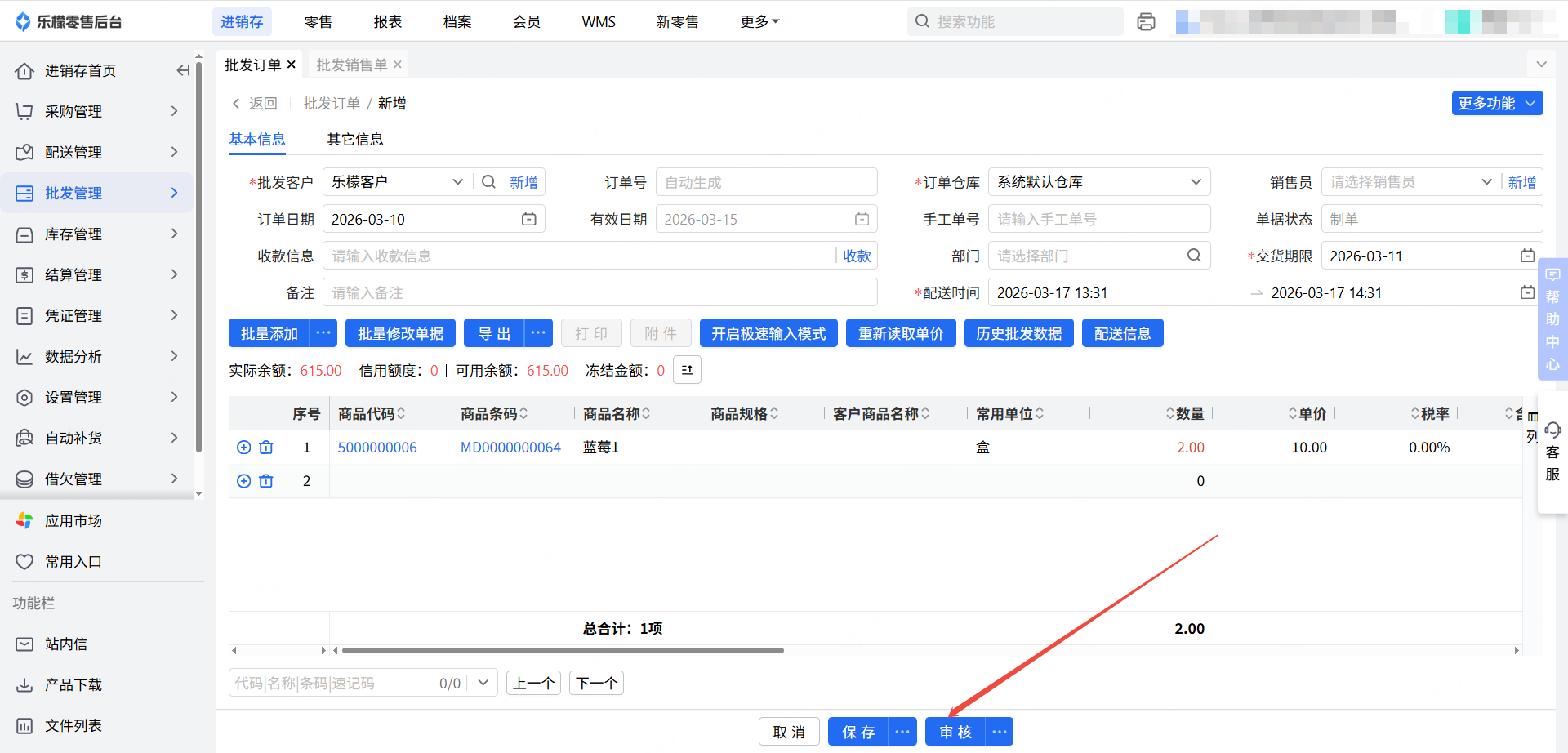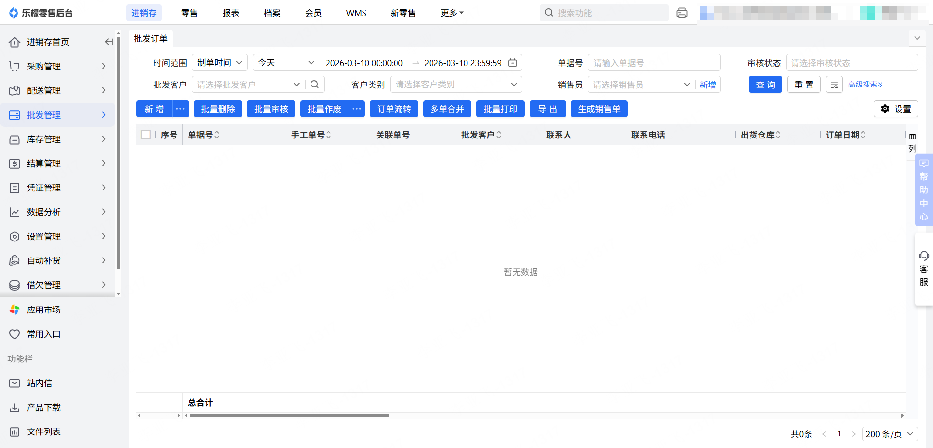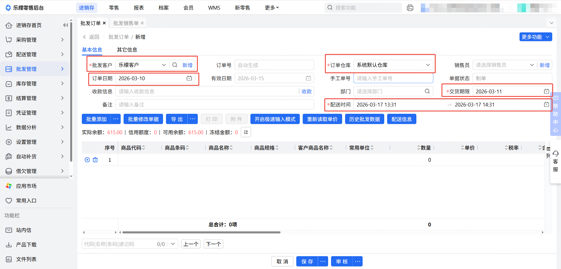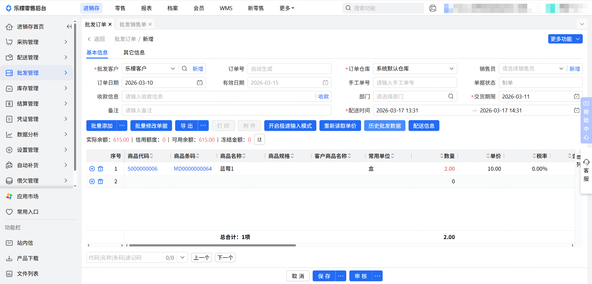 乐檬批发订单是面向批发业务的核心单据功能,用于处理批发客户订货、订单审核、转单出库、价格与应收管理,实现线上线下批发业务统一流转。