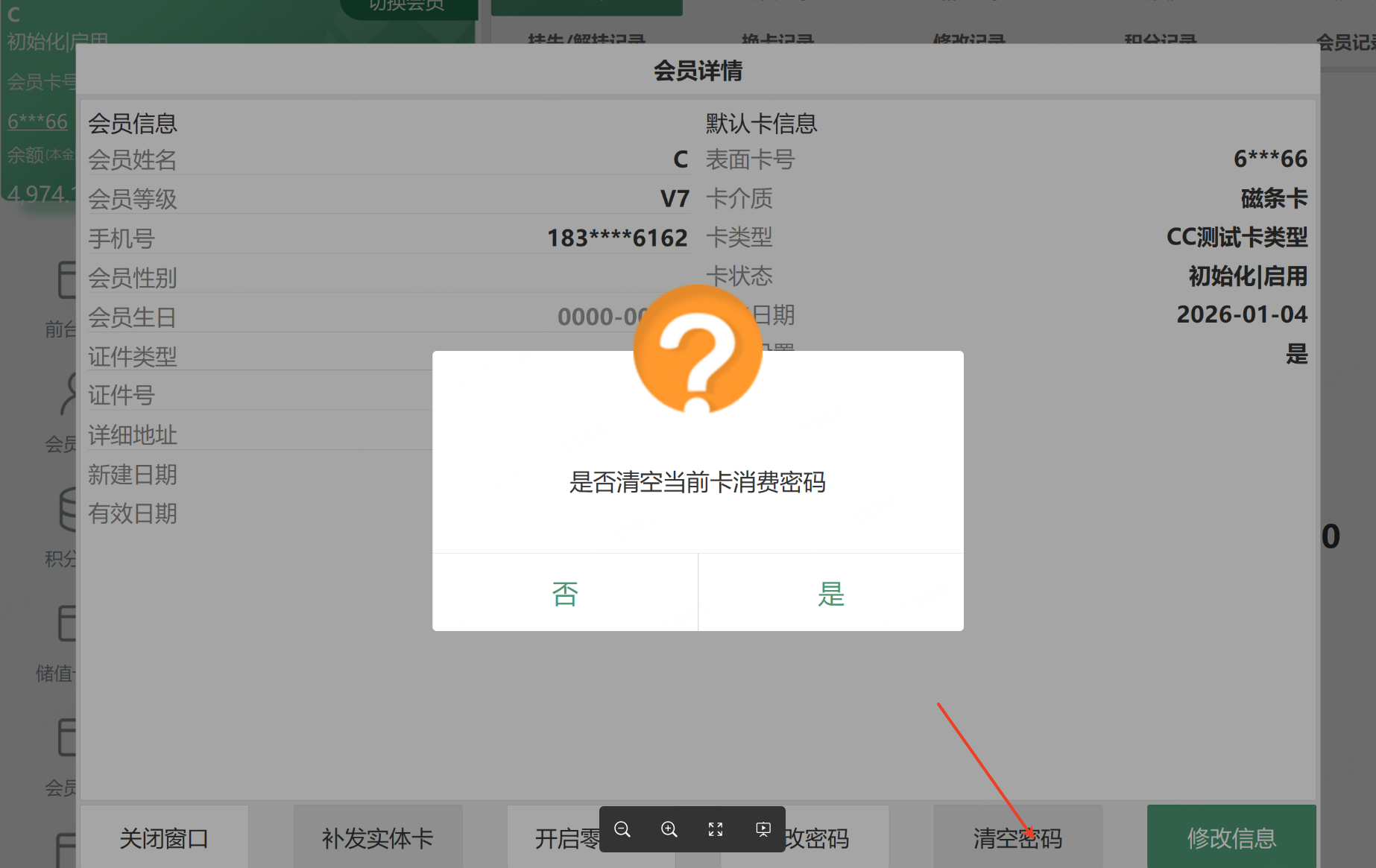 会员详情界面中新增【清空密码】选项,点击后弹窗提示:”是否清空当前卡消费密码”;选择是则将当前录入的卡消费密码进行清空,选择否则关闭弹窗