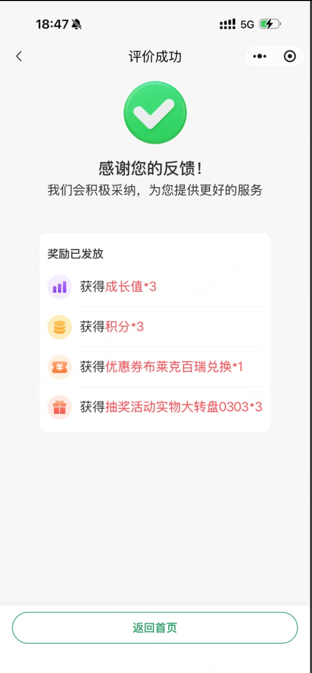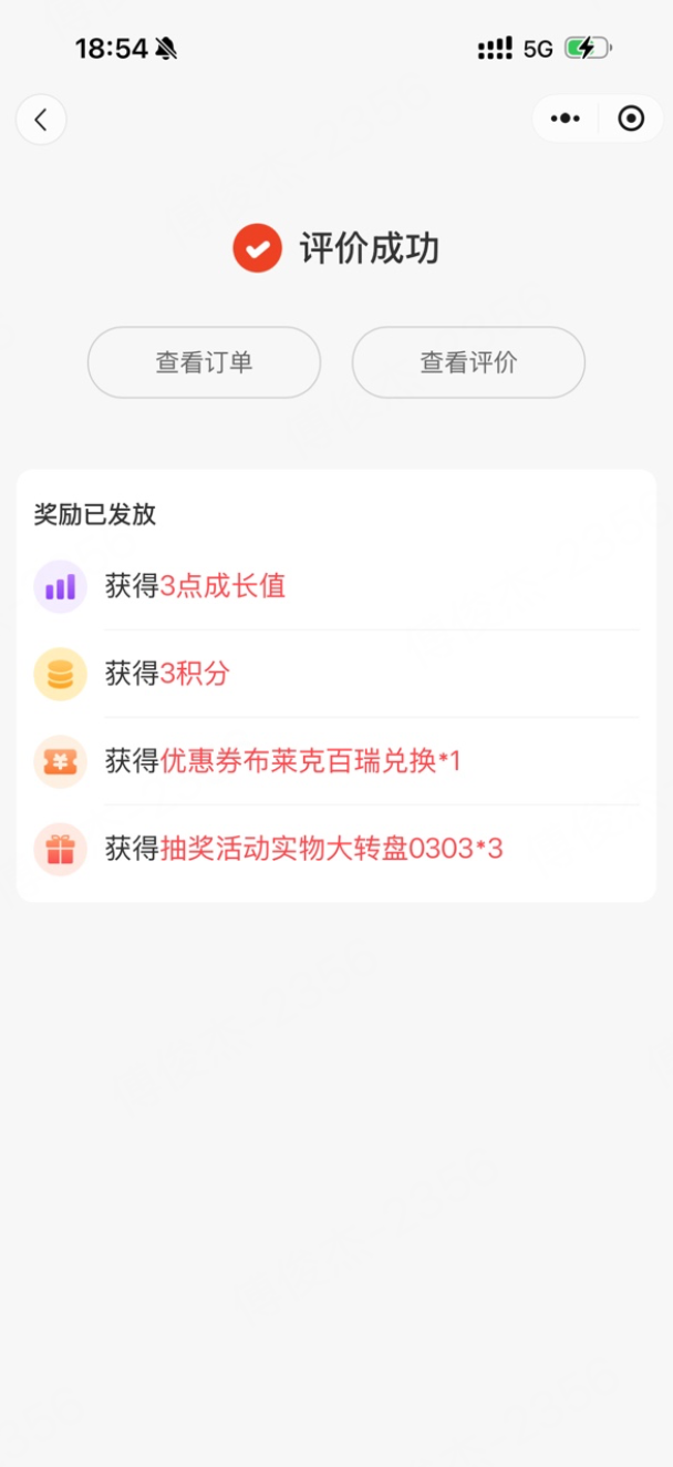 顾客端在评价页面将会看到此次评价后可获取的奖励信息: