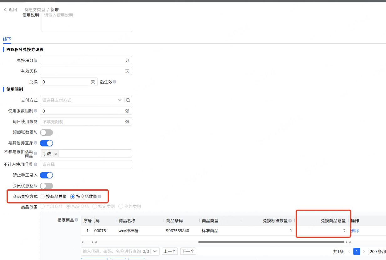 选择【按商品数量】后商品范围添加区域列新增【兑换商品总量】数据列,必填且仅支持输入数字;