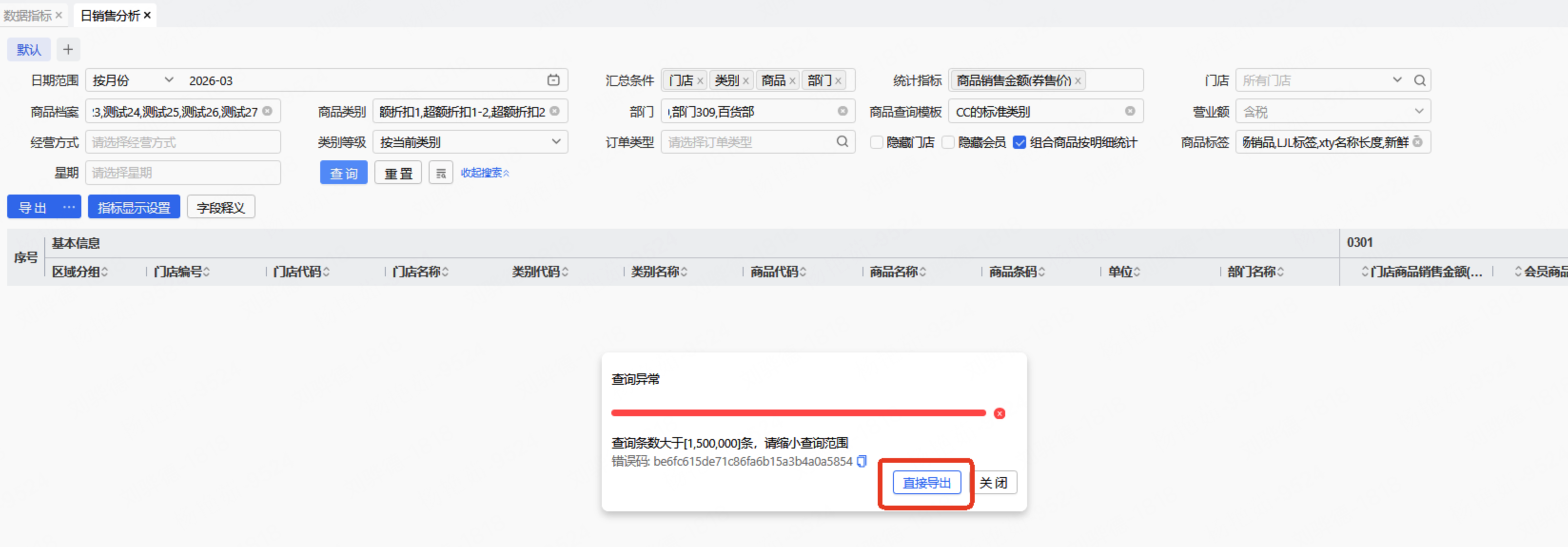 web-报表-日/月销售分析当查询超限制时,报错弹窗可以直接导出数据。