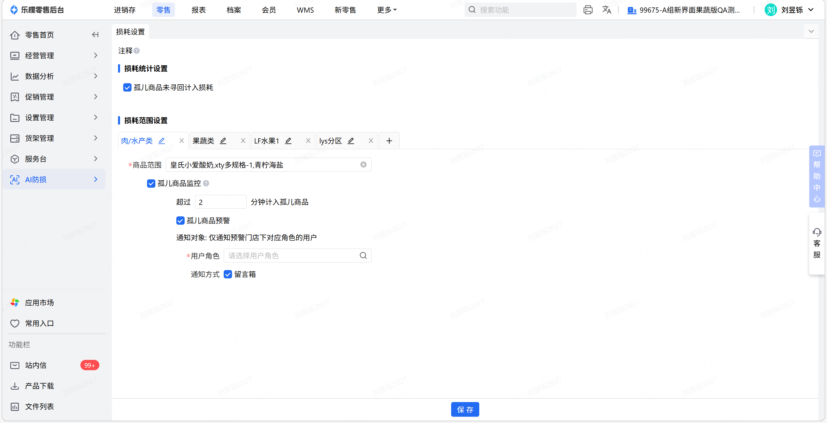1、损耗设置——设置分区,分区指定商品范围;设置预警预警、通知对象、通知方式