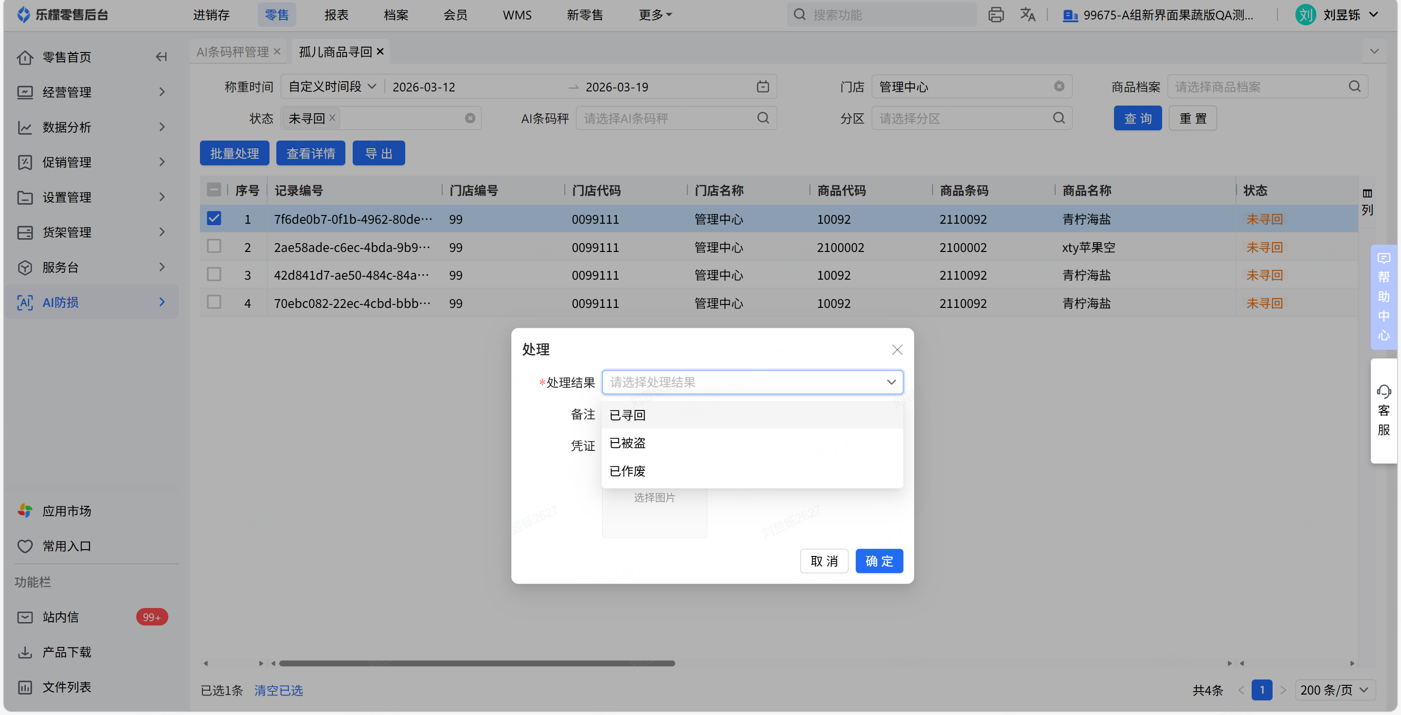 路径:web零售-AI防损-AI条码秤防损-孤儿商品寻回;app应用-零售经营管理-孤儿商品寻回