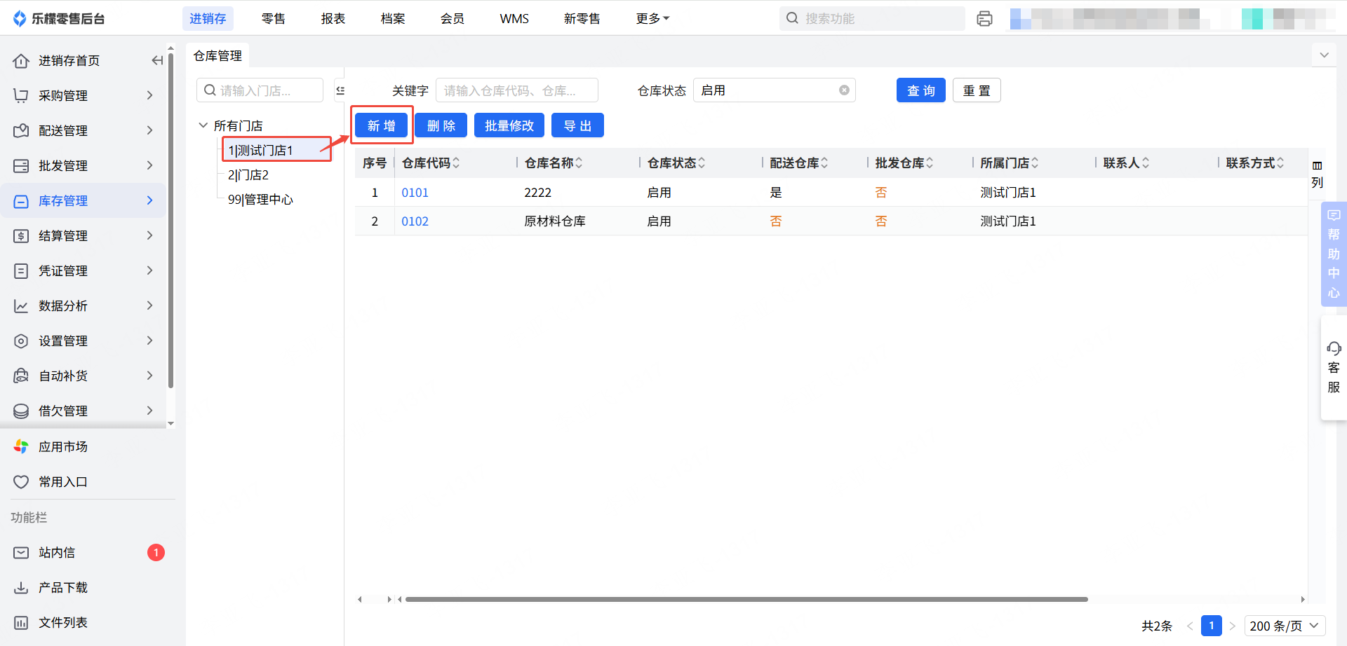 新增 | 给选中的门店新增一个仓库 |