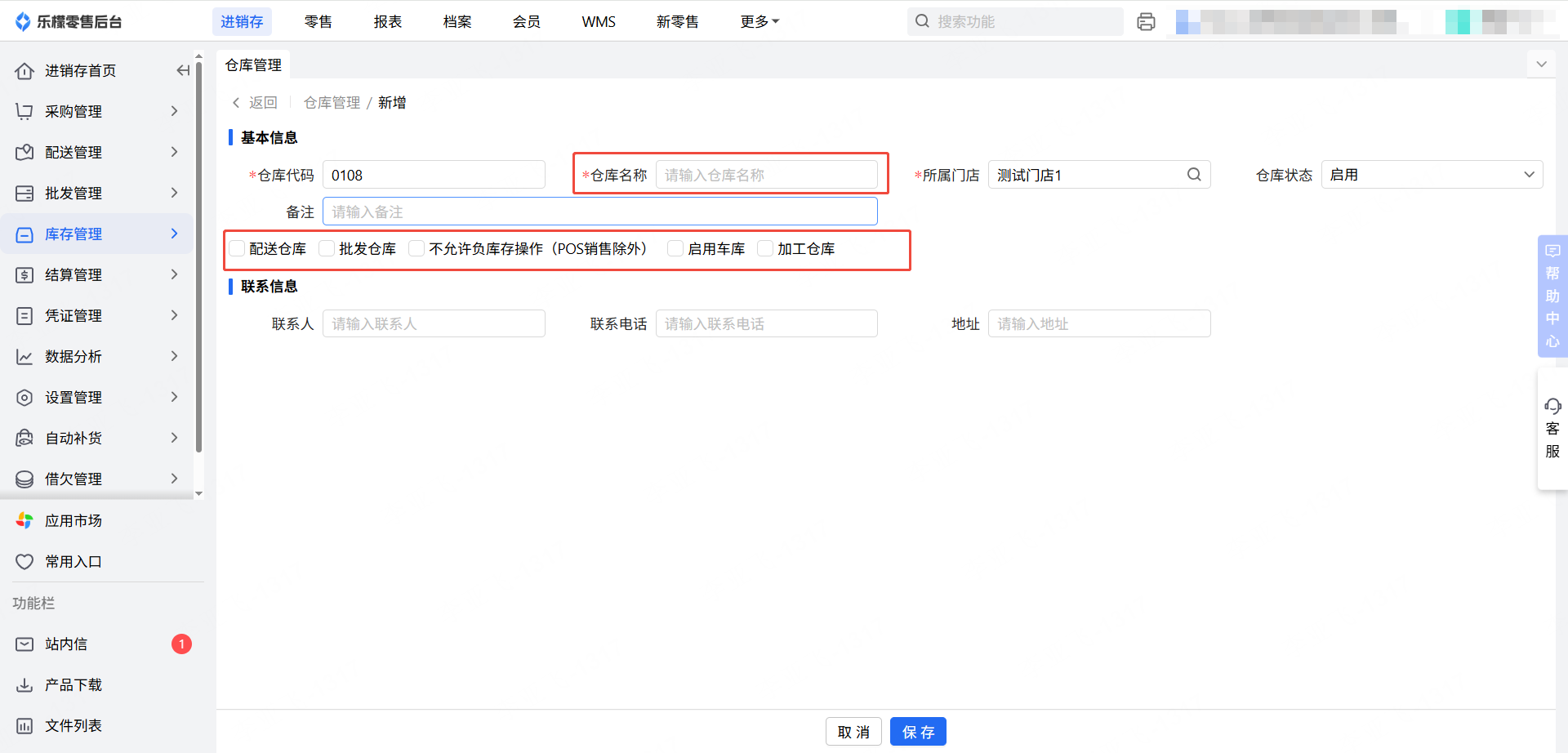 (不涉及配送、批发出库等业务,无需勾选配送仓库、批发仓库)