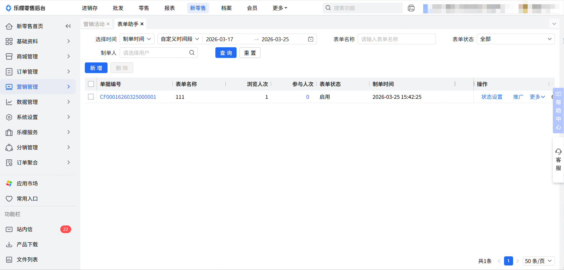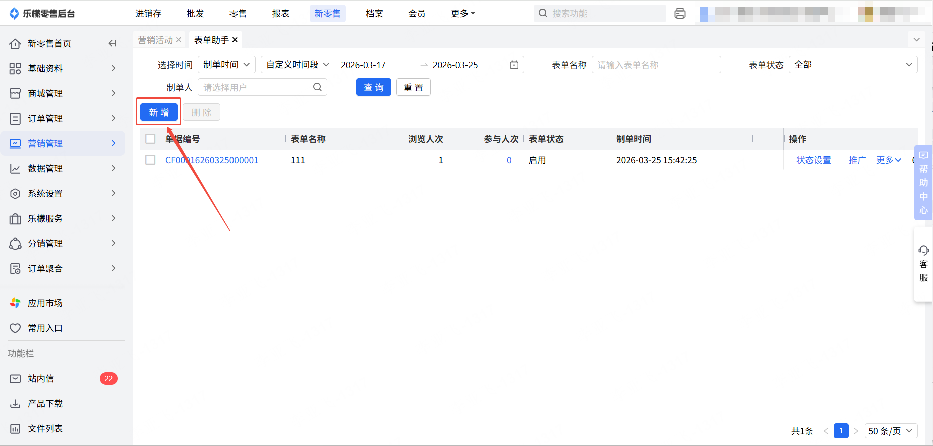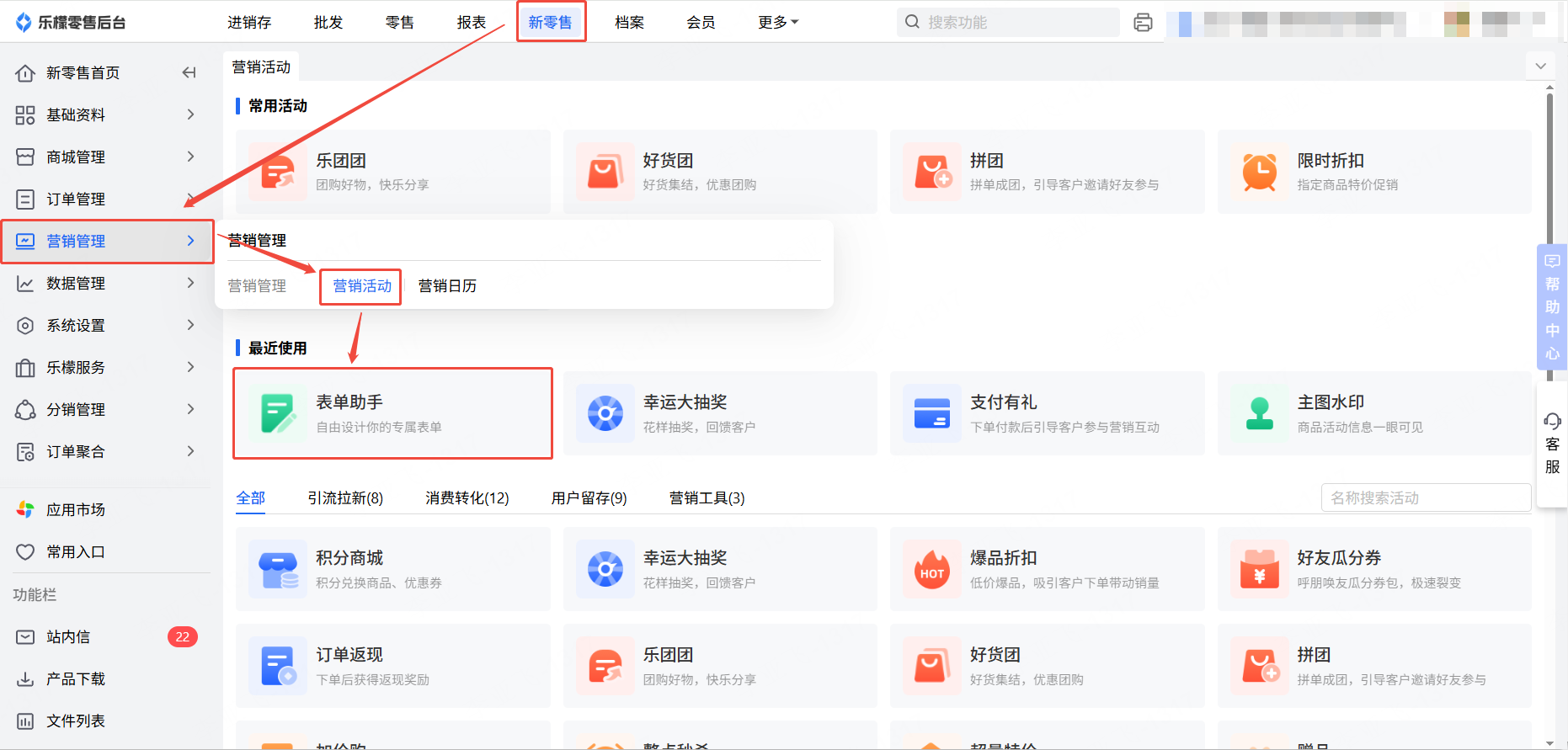 👉【操作路径】:新零售—营销管理—营销活动—表单助手