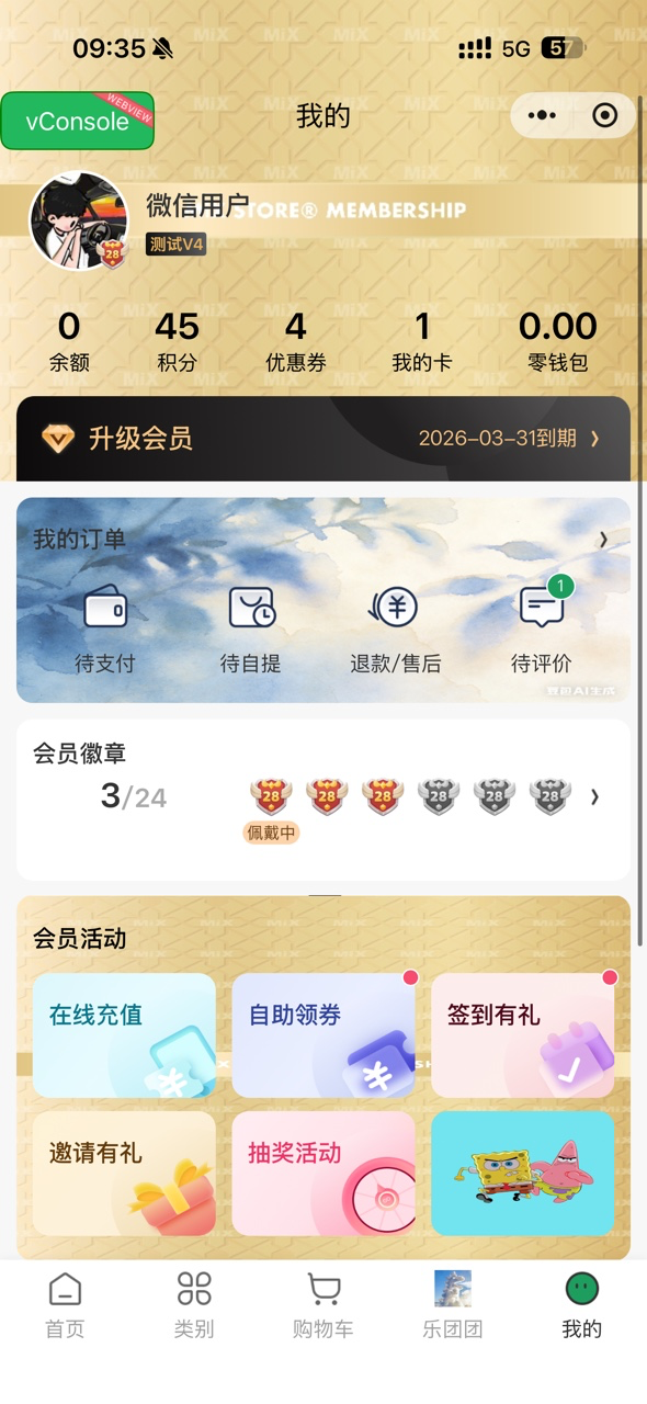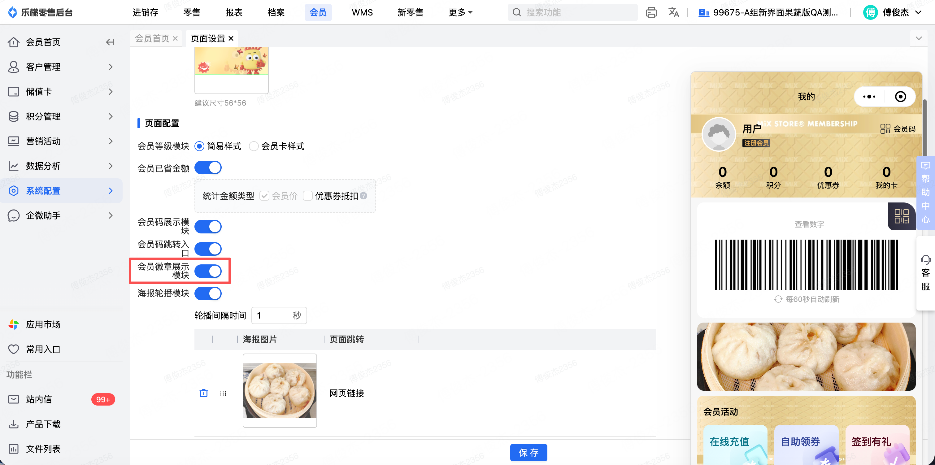 1、页面设置中,新增会员徽章展示模块,开启后,将会在顾客的「我的」页面中,展示会员徽章的入口
