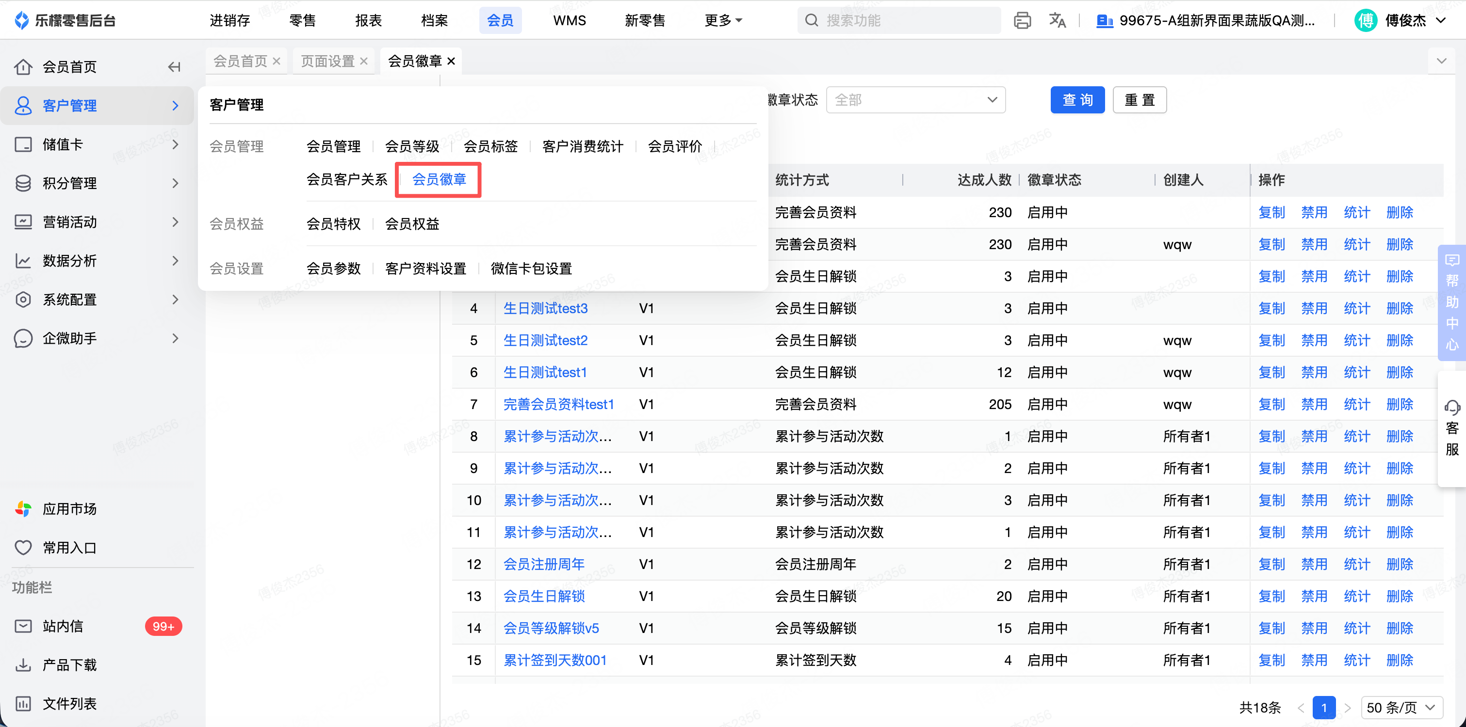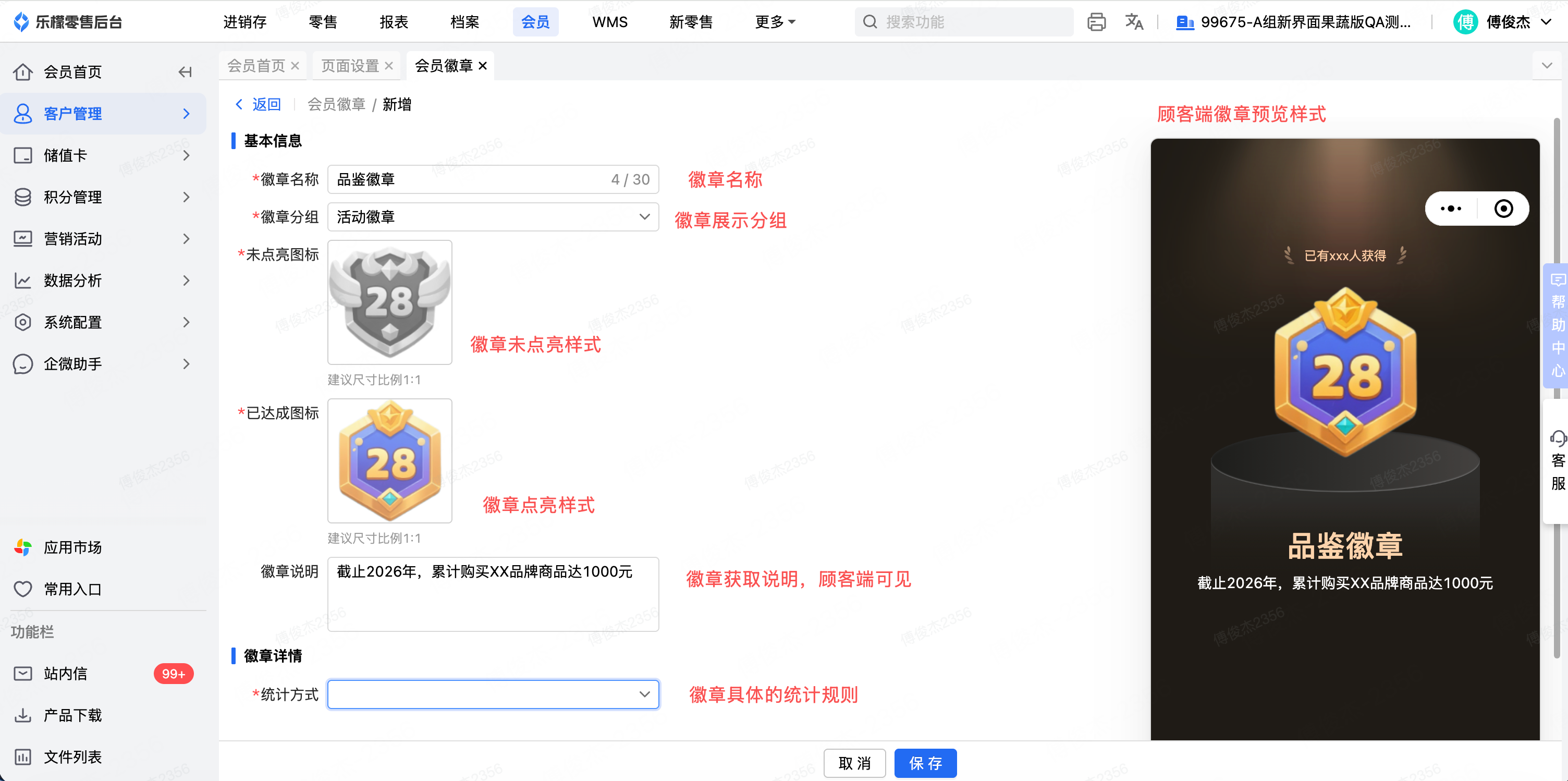 2、新增页面:客户管理-会员徽章,该页面可用于维护所有顾客端可见的徽章信息