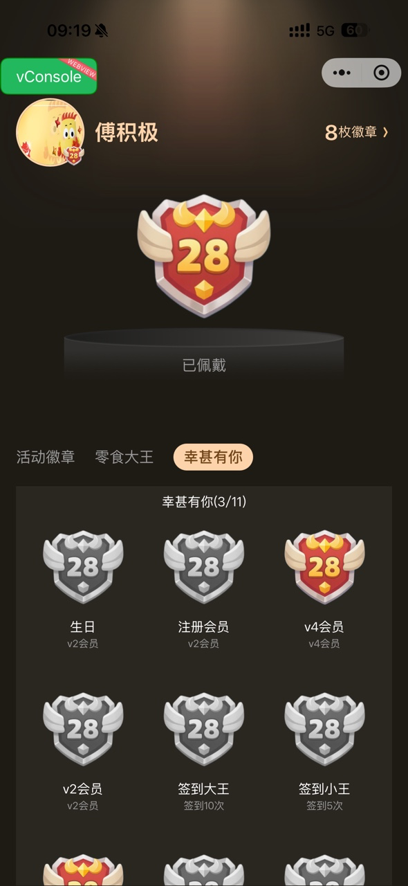 每个徽章可独立点击进入查看获取条件以及已获取的会员数量,已获取的徽章查看获取时间