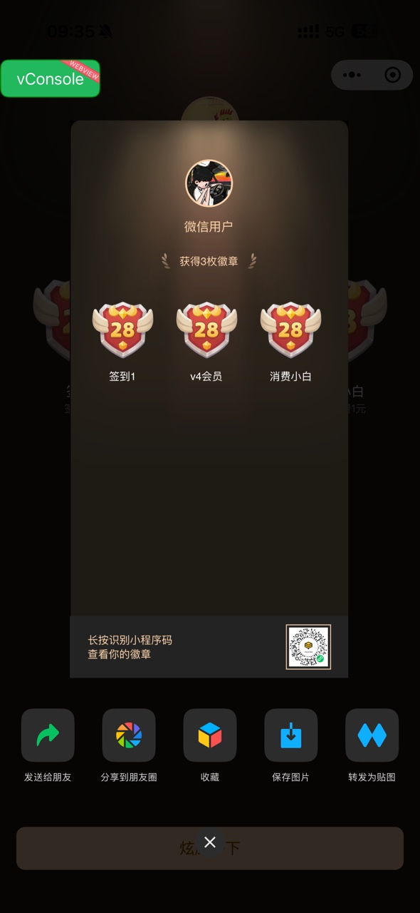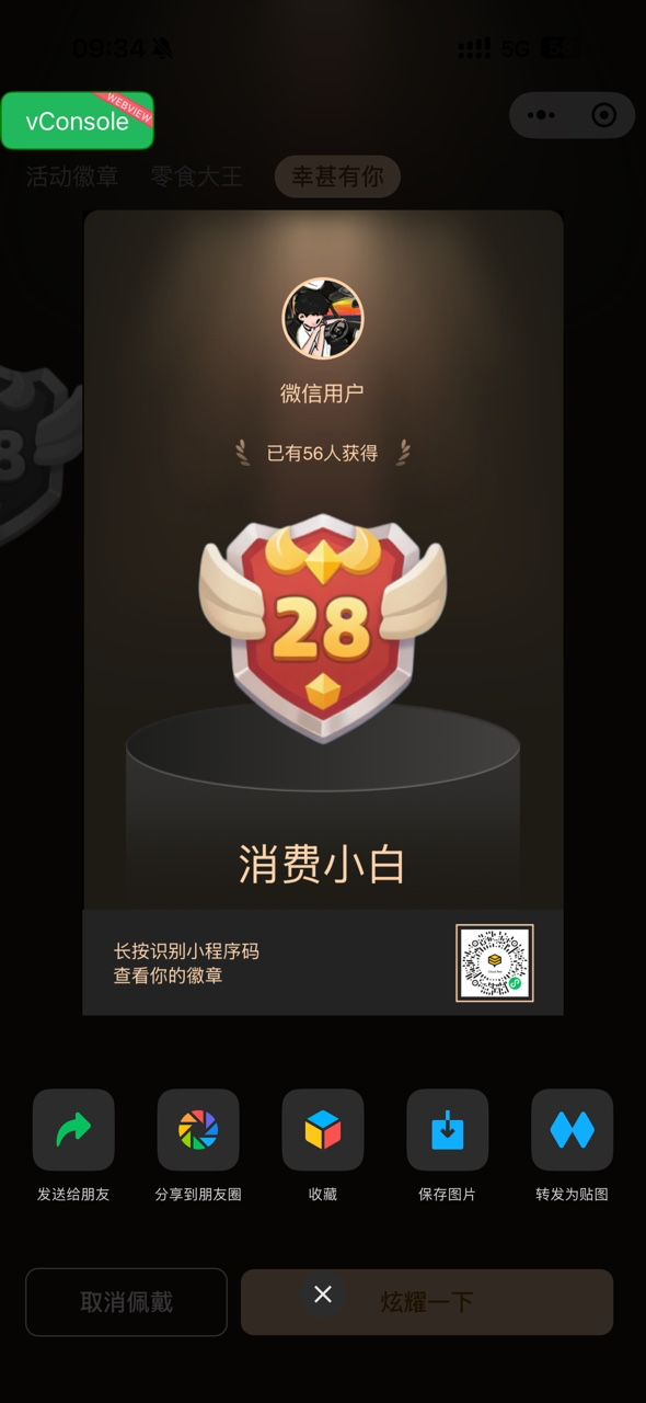 已获取的徽章,可点击「佩戴徽章」按钮后,将该徽章佩戴在顾客的头像右下角展示,也可以点击「炫耀一下」将当前徽章转发给好友查看,好友长按识别小程序码后,也可以进入自己的徽章页面查看