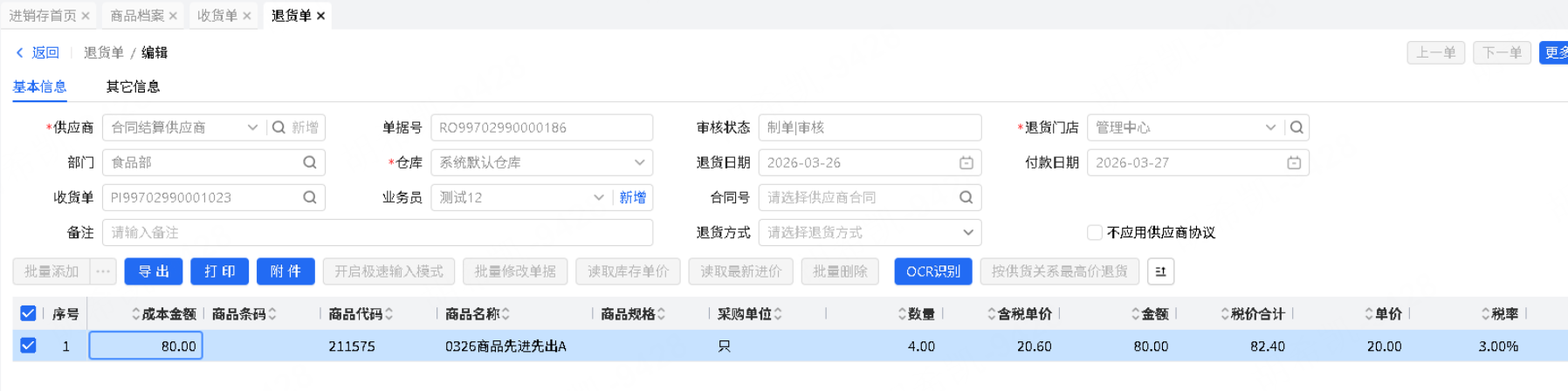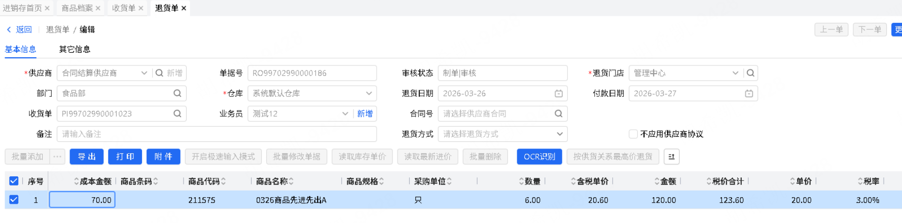 先进先出商品,若是退货单引用原单退货或者指定批次退货,且退货数量≤对应批次的库存数量,那么按对应先进先出批次的成本赋值