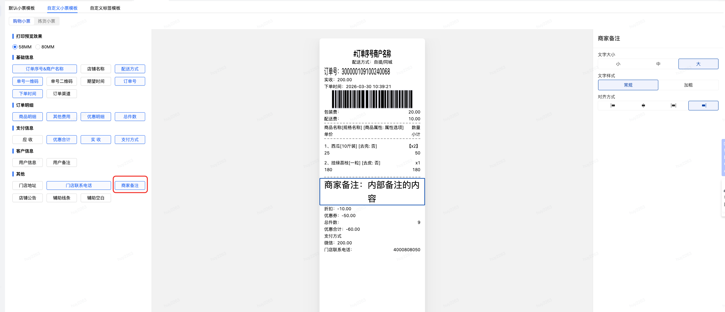 2、线上小票打印模板增加商家备注字段,需要的商家可以添加显示在小票上