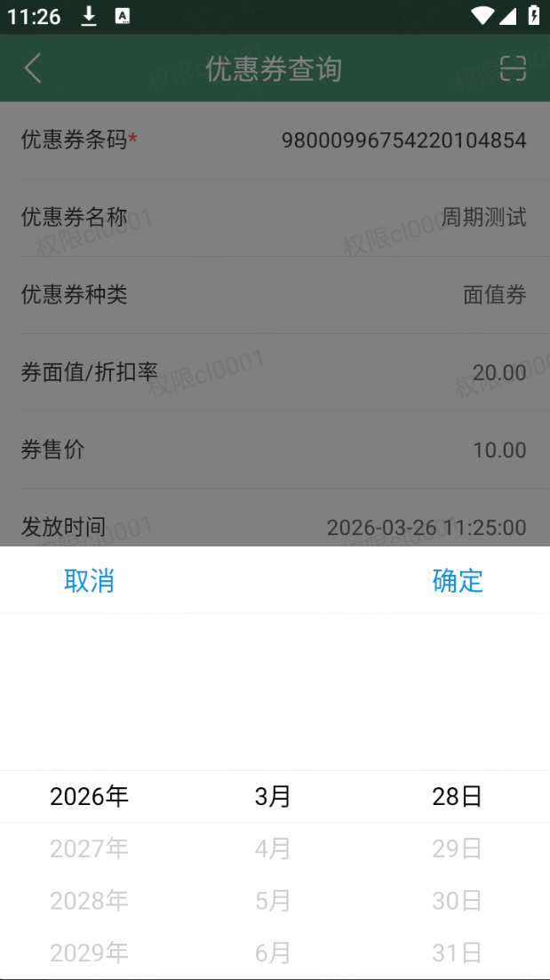 1、乐檬零售APP-优惠券查询页面中,针对拥有页面查询权限且拥有编辑权限的员工,可在优惠券查询后,点击优惠券有效期后方的「修改」按钮,操作修改当前优惠券的到期时间