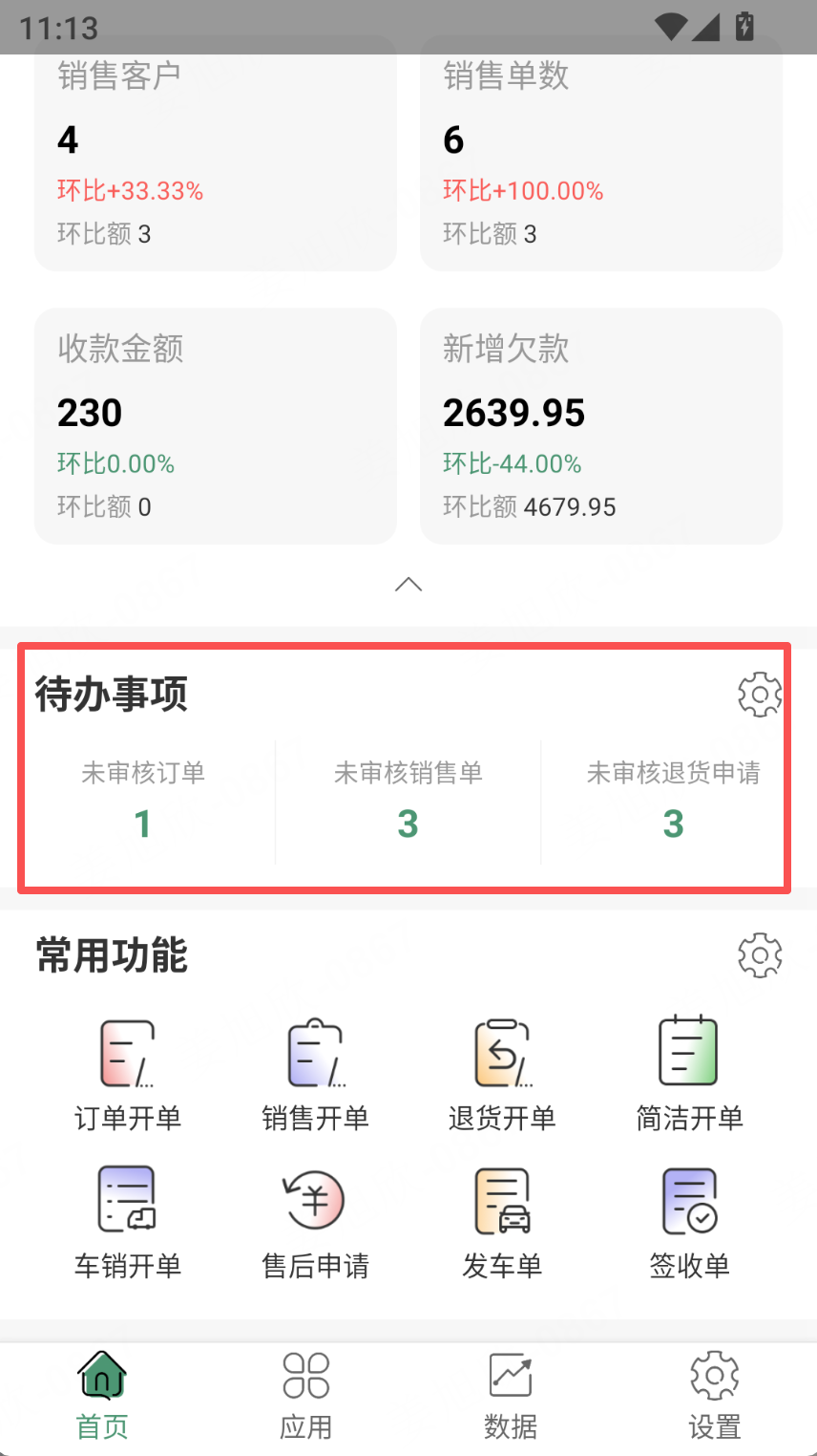 1、首页增加一个模块“待办事项”,默认展示未审核订单、未审核销售单、未审核退货申请,最多展示三个;