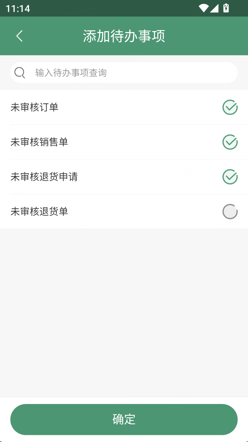 点击右上角设置跳转至“添加待办事项”页面,可以设置待办事项的展示内容,最多三个,最少0个;枚举值:未审核订单、未审核销售单、未审核退货申请、未审核退货单