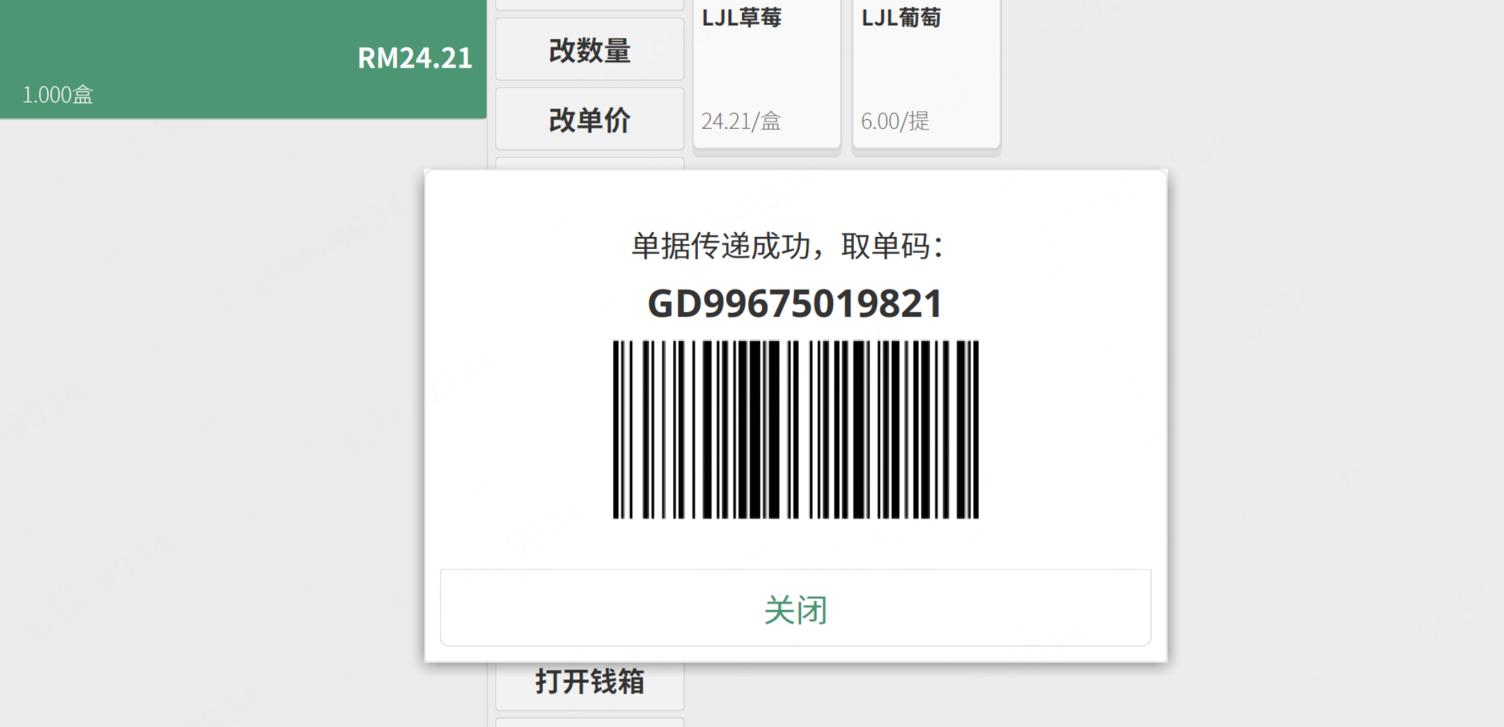 1、功能点击后将当前界面单据内信息进行rsdis推送;生成取单码(规则:“GD+账套号+门店号+顺序位”,例如:GD99675010001)并自动打印取单条码小票;上传后当前界面商品清空;界面提示:“单据已上传,取单号【xxxxxxxxxx】”