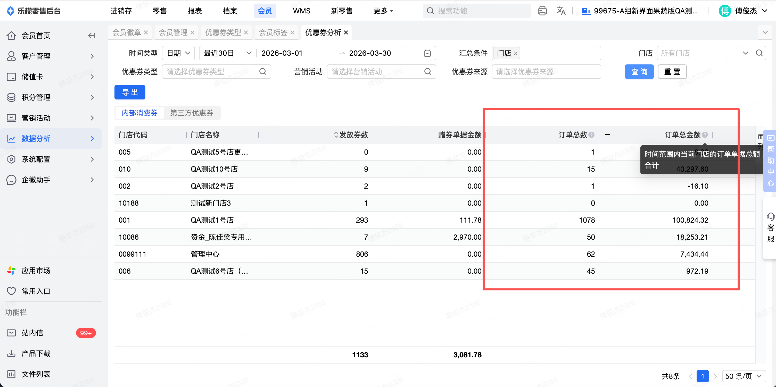 全渠道会员-优惠券分析页面,在汇总条件选择包含「门店」或「营业日」时,列表中新增字段「订单总数」和「订单总金额」: