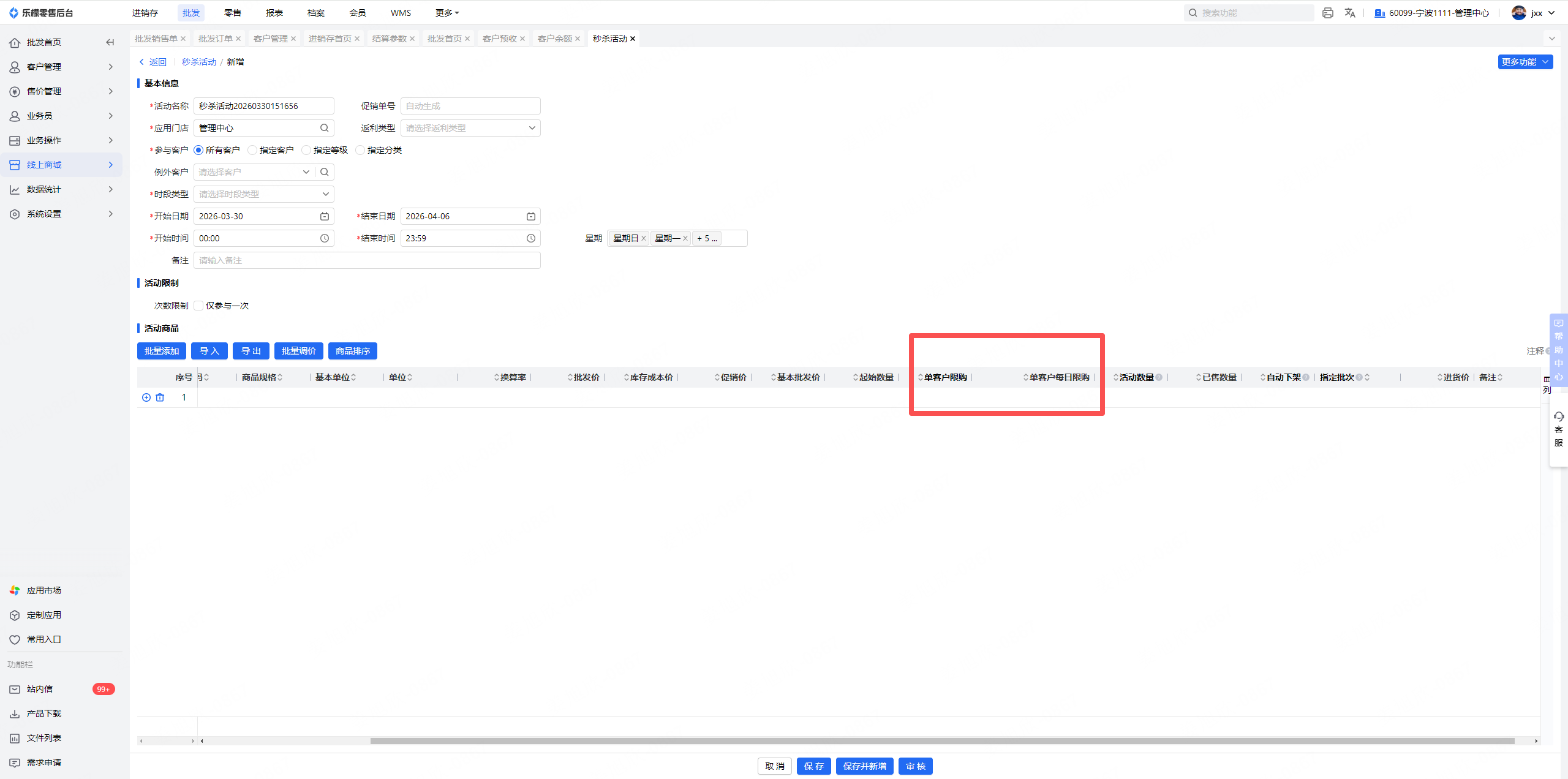 批发促销特价现在单客户每日限购,批发秒杀活动也需要增加这个限制