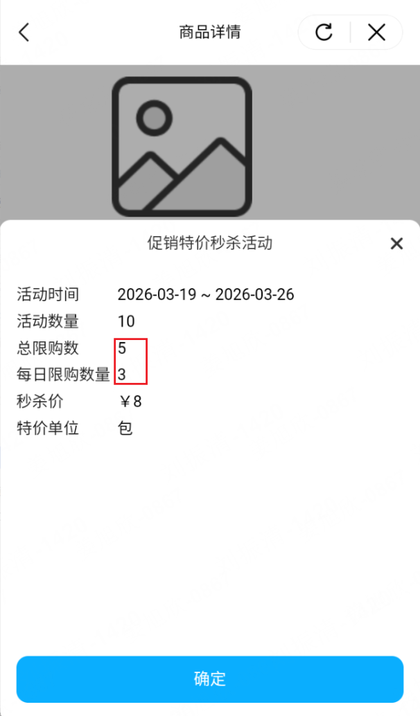 3、秒杀活动商品展示的限购数量优先级:单客户每日限购>单客户限购