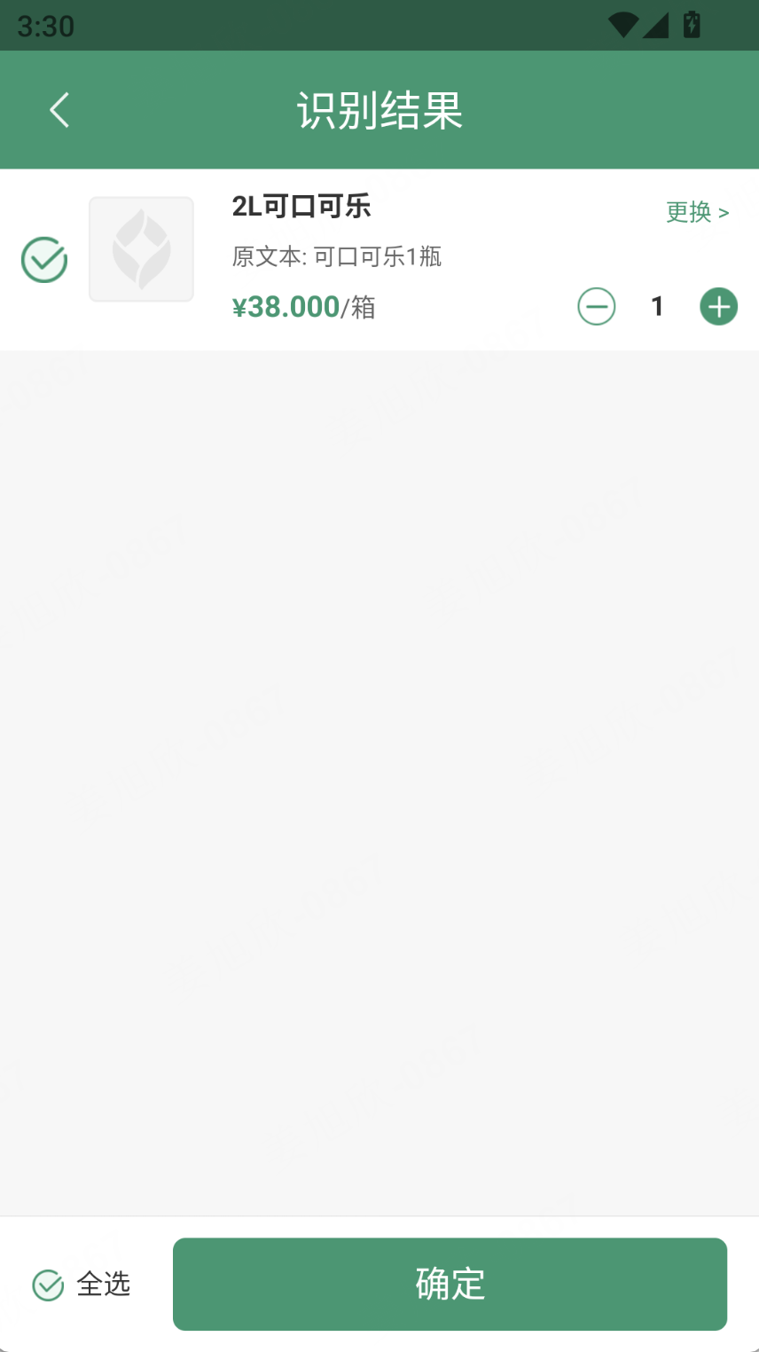 2、识别结果:支持单选或全选商品后点击确定后加入到商品清单页面;可直接增减商品数量(不能为0),也可删除商品;点击更换,跳转至商品搜索页面,只能选择一个商品来进行替换