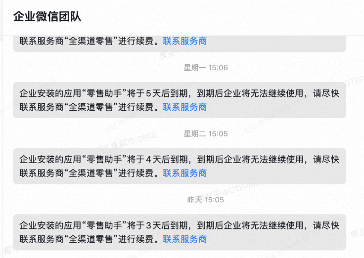 企业安装的应用“零售助手”将于X天后到期,到期后企业将无法继续使用,请尽快联系服务商“全渠道零售”进行续费。