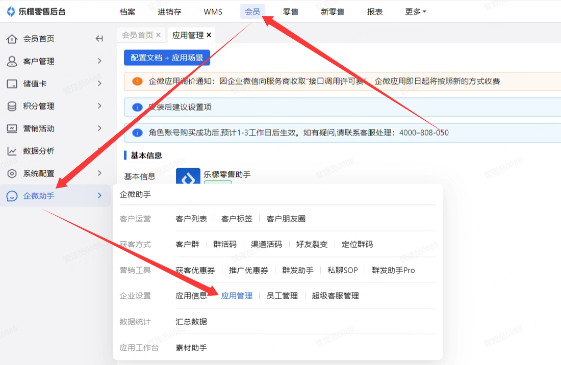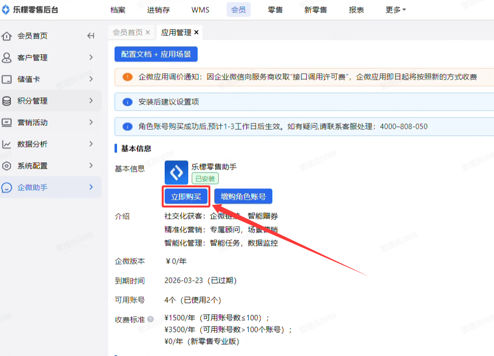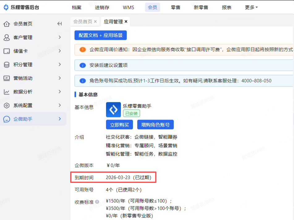 进入“会员-企微助手-应用管理”中,查看零售助手应用是否到期