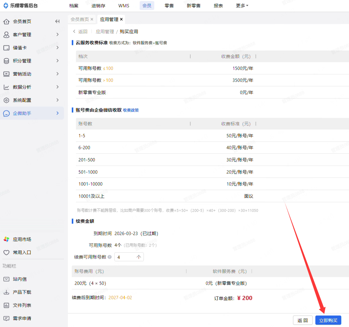 在“会员-企微助手-应用管理”中,点击“立即购买”,提交续费订单即可