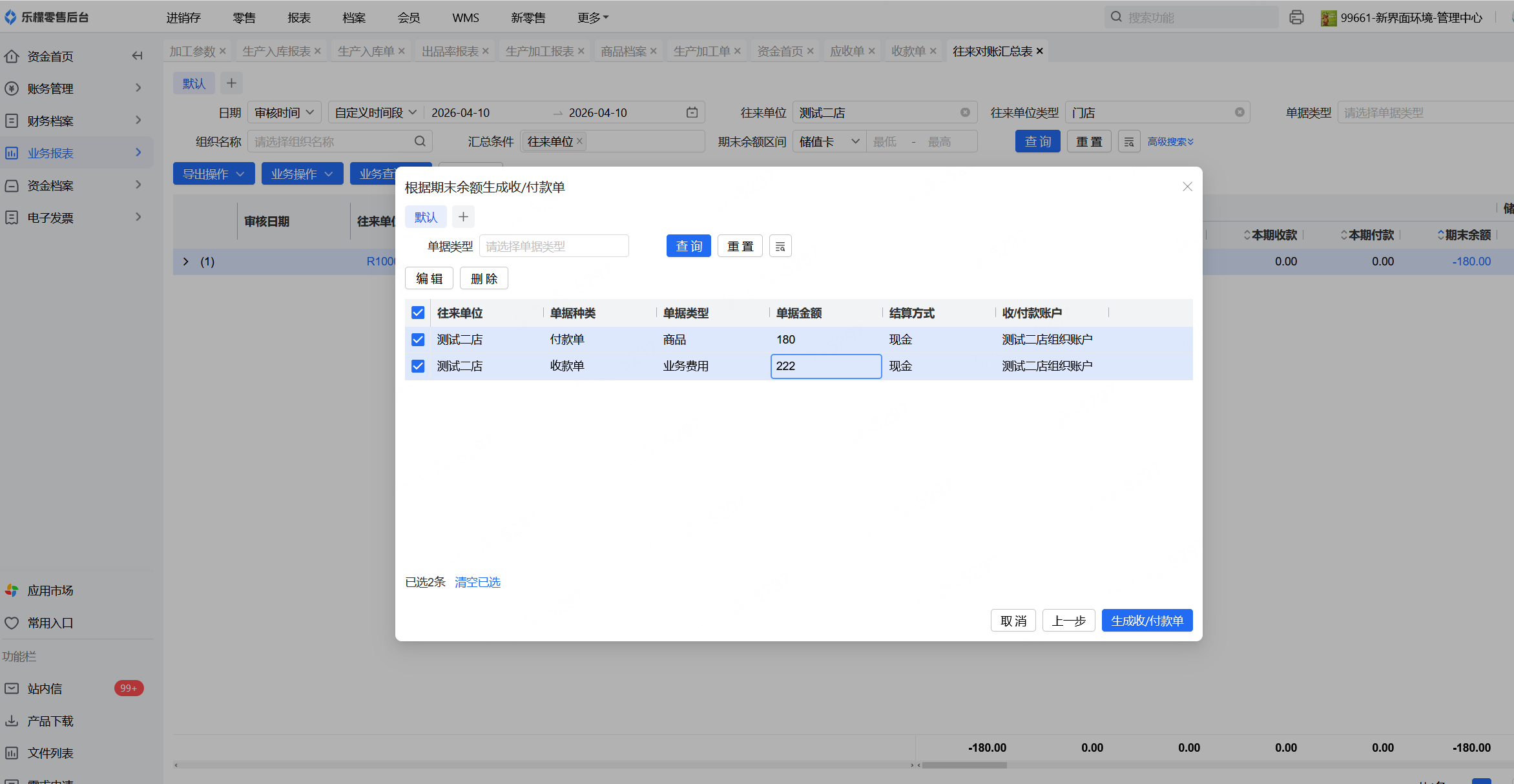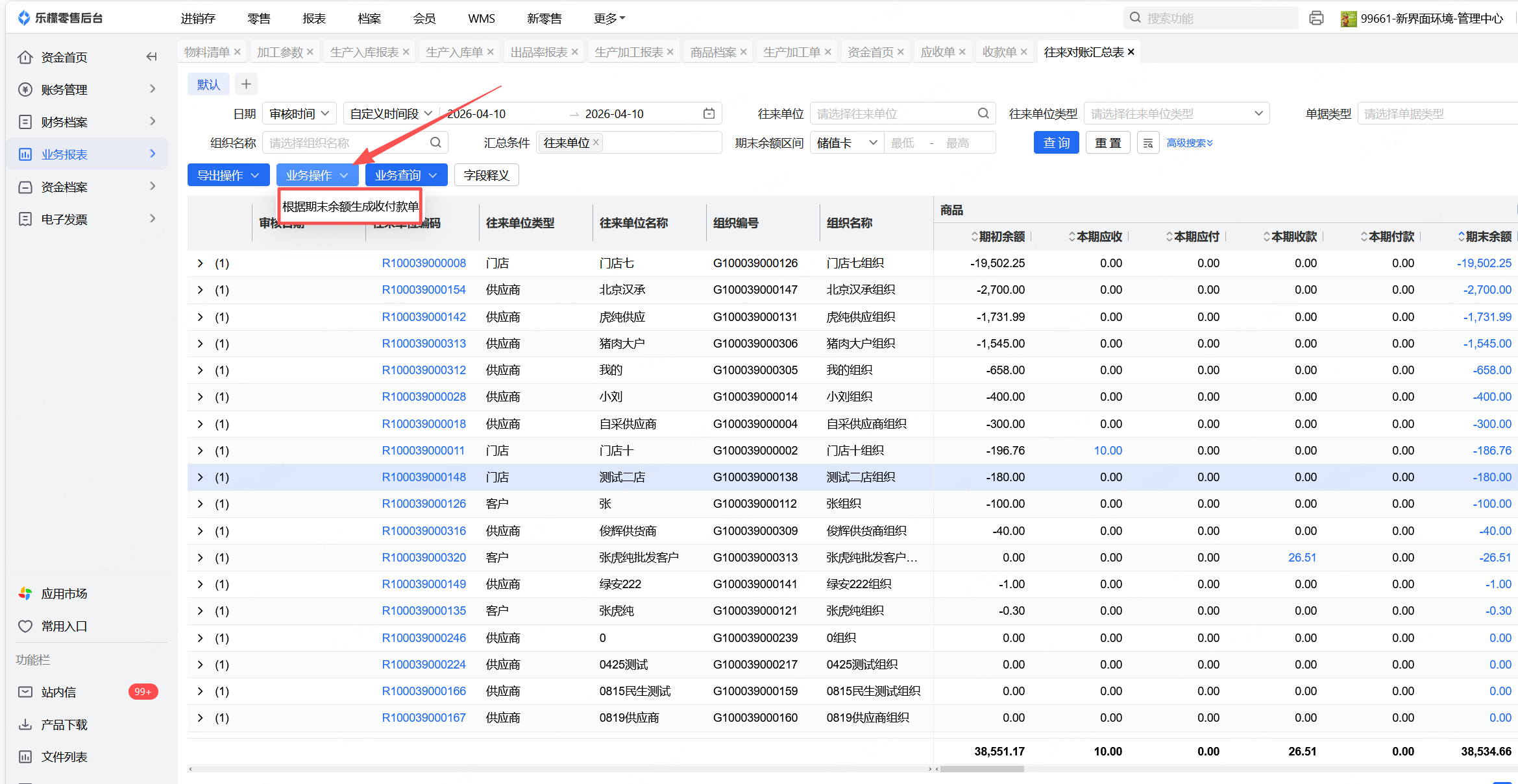 通过业务操作中的根据期末余额生成收付款单功能