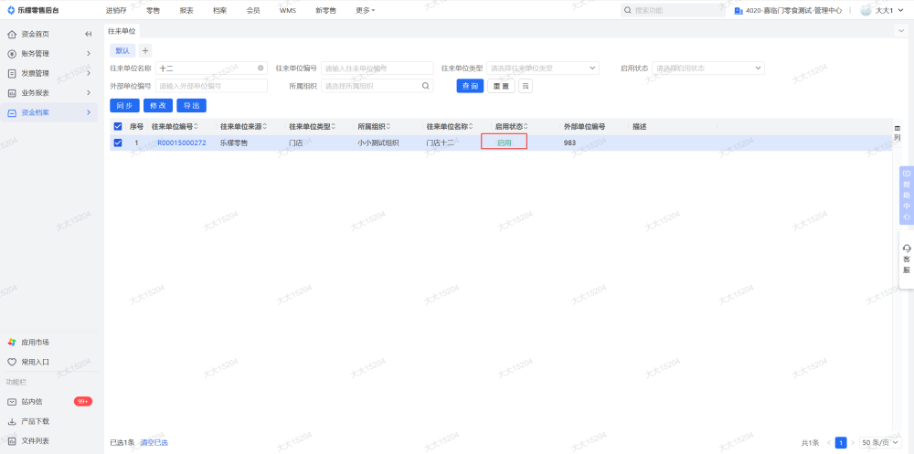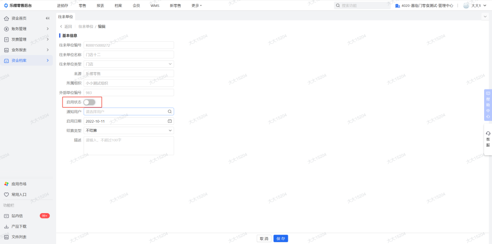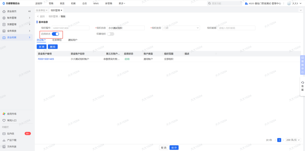 资金账户和往来单位删除之后把组织改成禁用