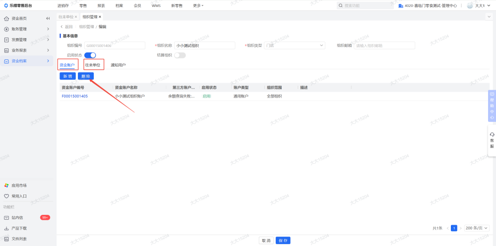 7、组织管理里面删除资金账户和往来单位