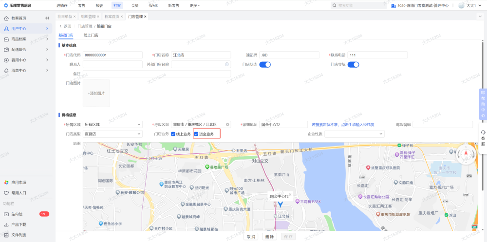8、在档案-用户中心-门店管理中,把门店的资金业务关闭