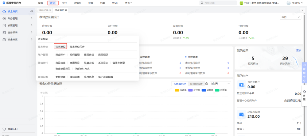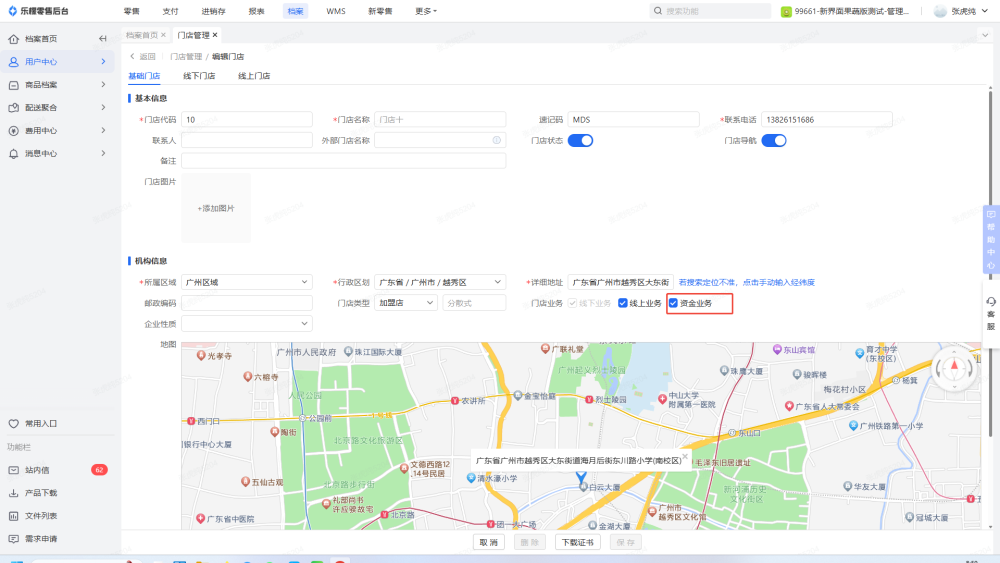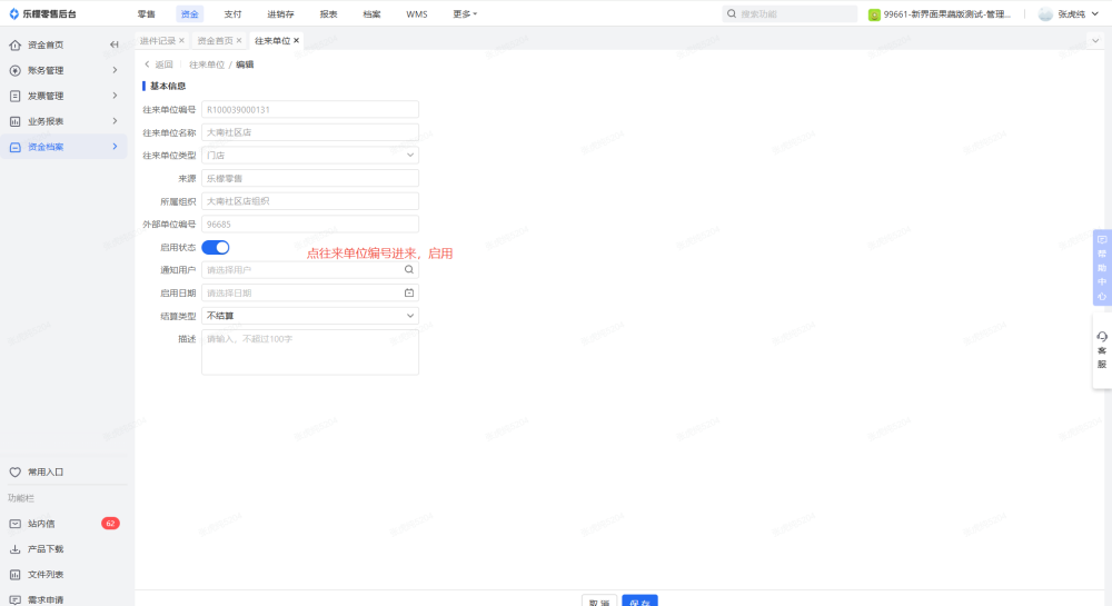 1、档案-用户中心-门店管理,需要开启资金的门店启用资金业务