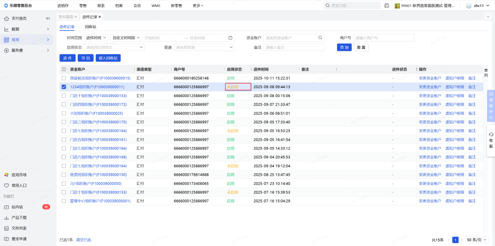 进件记录完成后,商户号还是未启用状态,需要在应用-支付-资金账户里,选择对应的商户号后切换