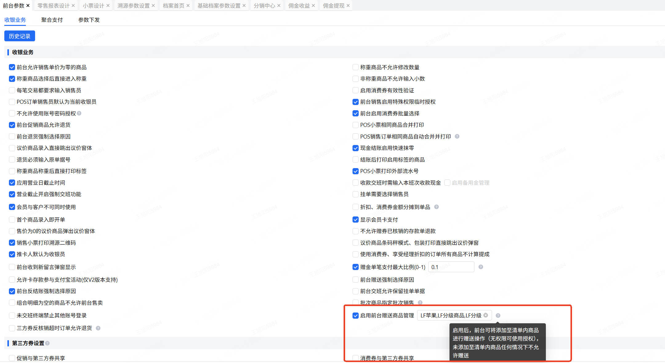 获取前台参数内【启用前台赠送商品管理】开启,关闭时维持现状