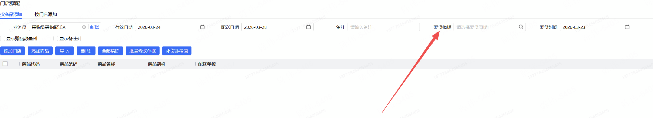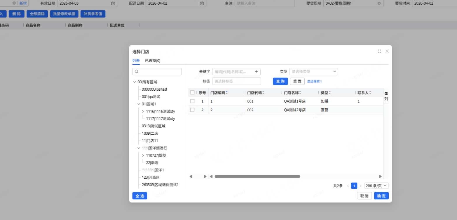选择完要货周期之后,添加门店、商品,需要按要货周期内的门店、商品进行过滤