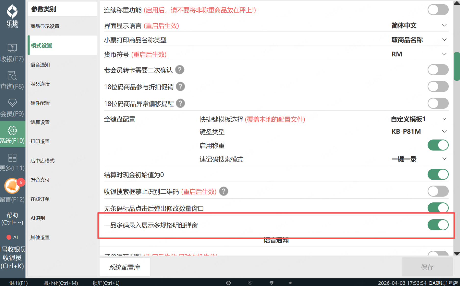 快捷键模式,参数设置 - 模式设置,新增参数【一品多码录入展示多规格明细弹窗】