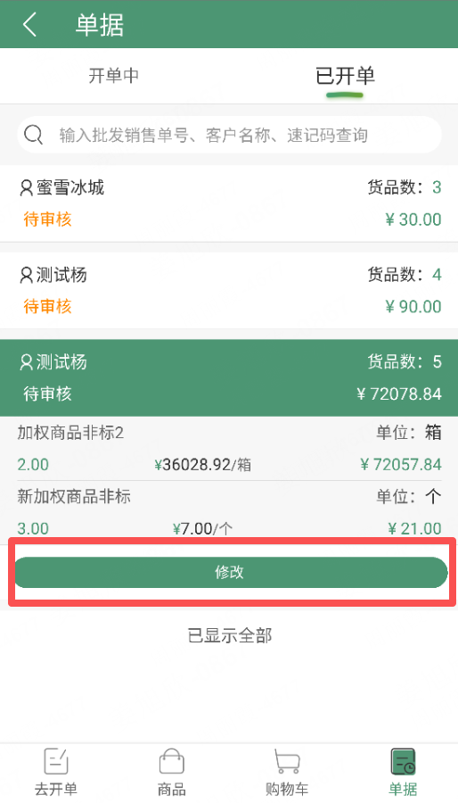 3、已提交未审核的单据可修改单据(编辑权限控制),点击修改进入单据修改页面;