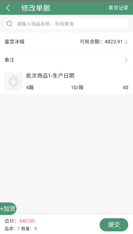 4、单据修改页面可删除、添加、修改商品数据,修改后提交重新保存单据数据;