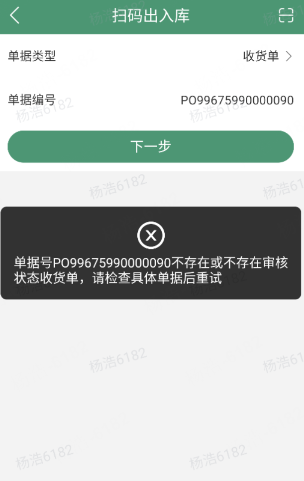 若是采购订单不存在或不存在关联的审核的收货单,那么提示“单据号[xxxxxxxxxxxxxx]不存在或不存在审核状态收货单,请检查具体单据后重试