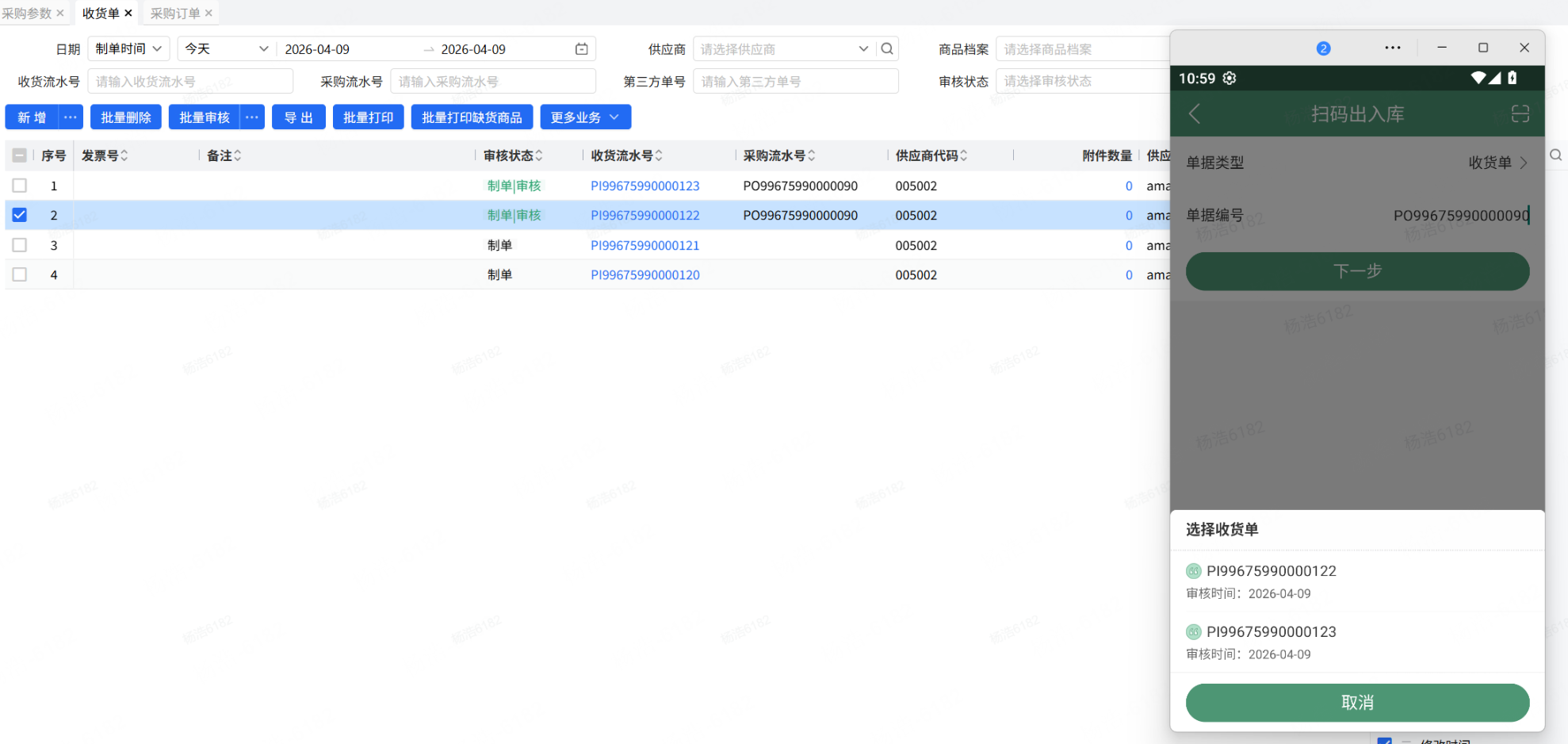 若是采购订单关联多张“审核”的收货单,那么底部半屏拉起,展示多条审核的收货单,选择后进入扫码出入库商品明细界面