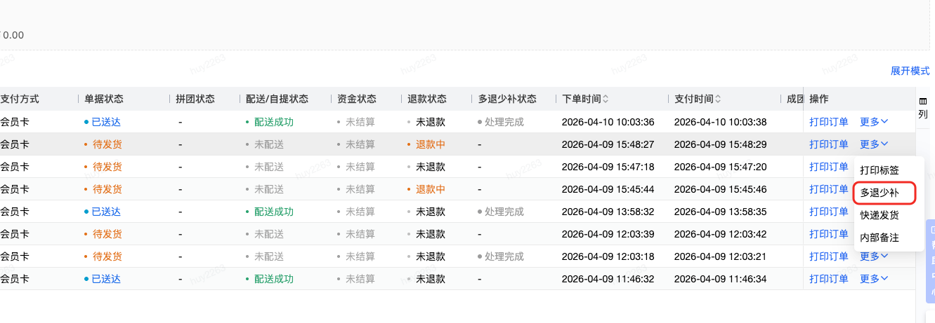 商家线上卖生鲜快递发货,如果重量少了需要退差,需要支持快递订单多退少补。